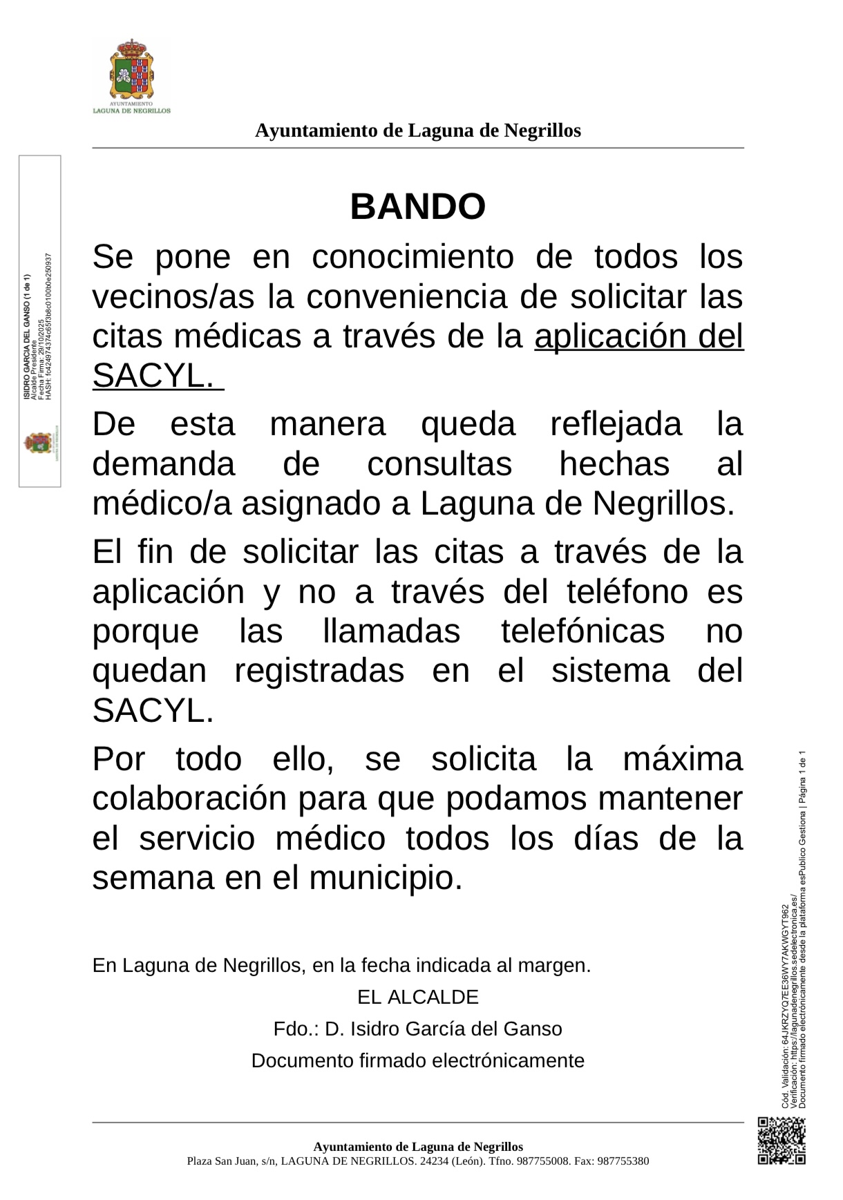 Se pone en conocimiento de los/as vecinos/as la conveniencia de solicitar las citas médicas de atención primaria a través de la aplicación “Sacyl Conecta”.