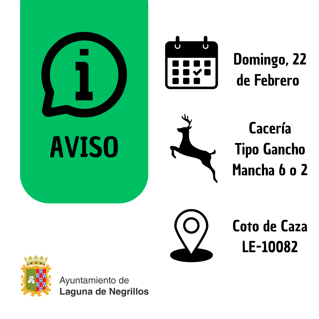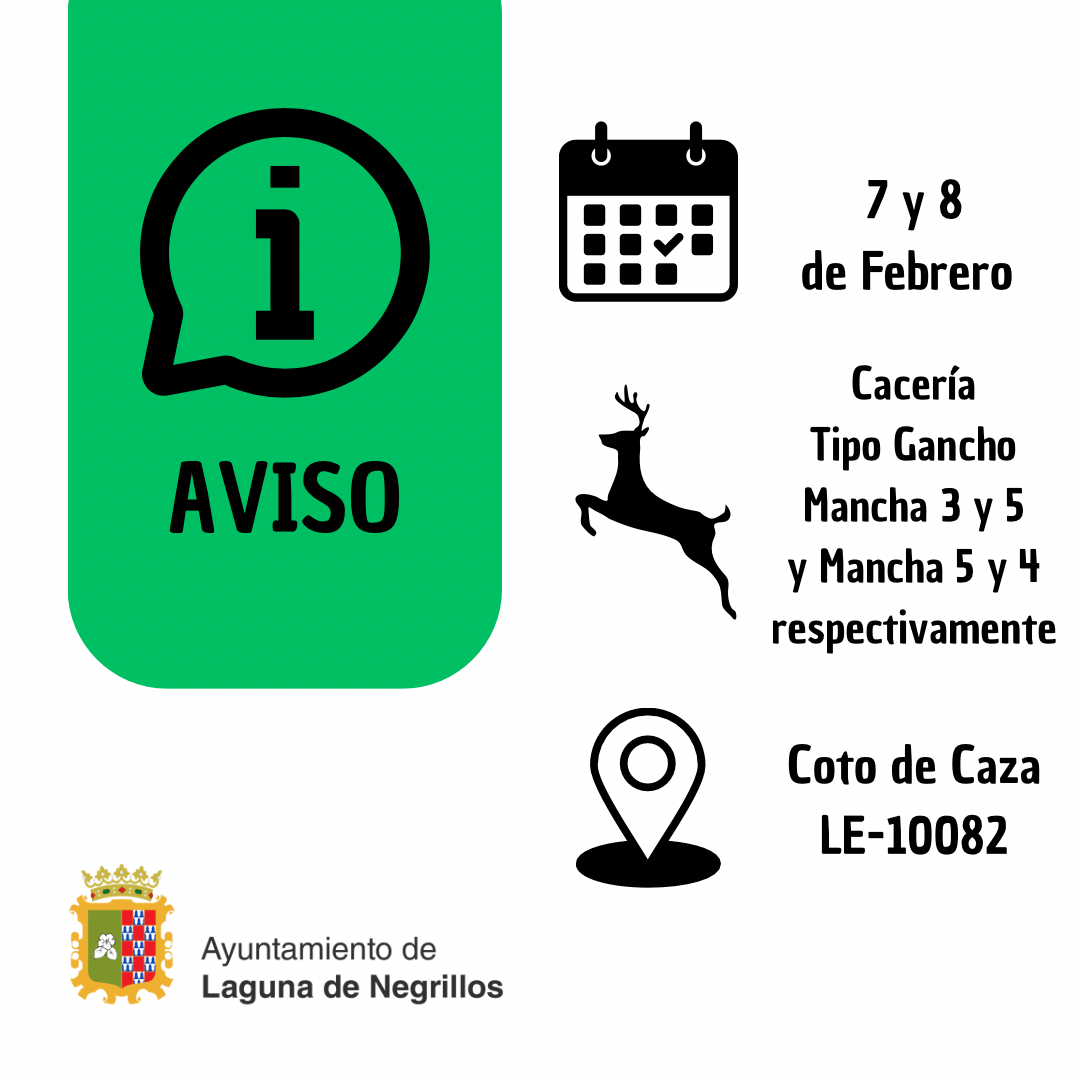 El Servicio Territorial de Medio Ambiente de León nos informa de la siguiente cacería colectiva de tipo Gancho que tendrá lugar en el coto de caza LE-10082 el sábado 7 de febrero de 2026 en la mancha 3 y 5 y el domingo 8 de febrero de 2026 en la mancha 5 y 4.