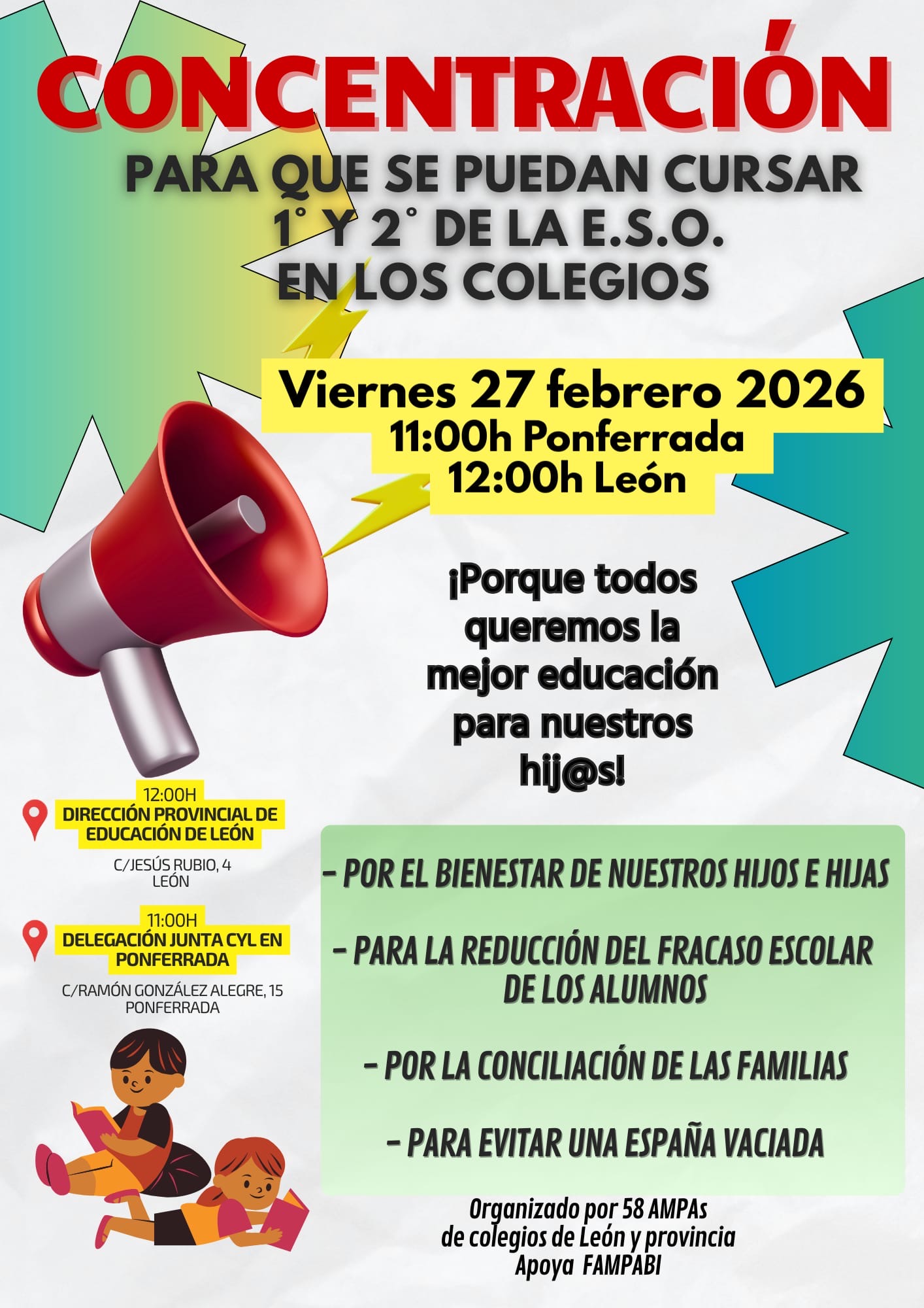 Las Asociaciones de Madres y Padres de Alumnos (AMPAs) de León han convocado una concentración el próximo viernes 27 de febrero de 2026 a las 12:00 horas para reclamar que el alumnado pueda cursar 1º y 2º de la Educación Secundaria Obligatoria (ESO) en los colegios.