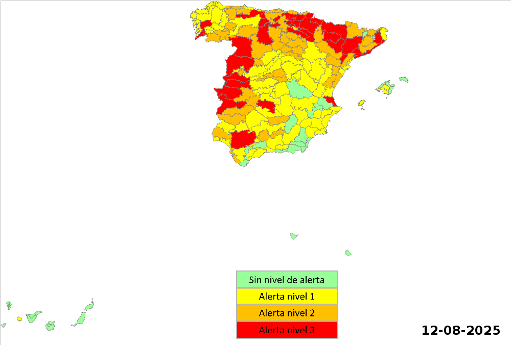 Nivel de riesgo “3”, alto (rojo): en las zonas de meteosalud: Norte de Cáceres, Meseta cacereña, Taj(...)