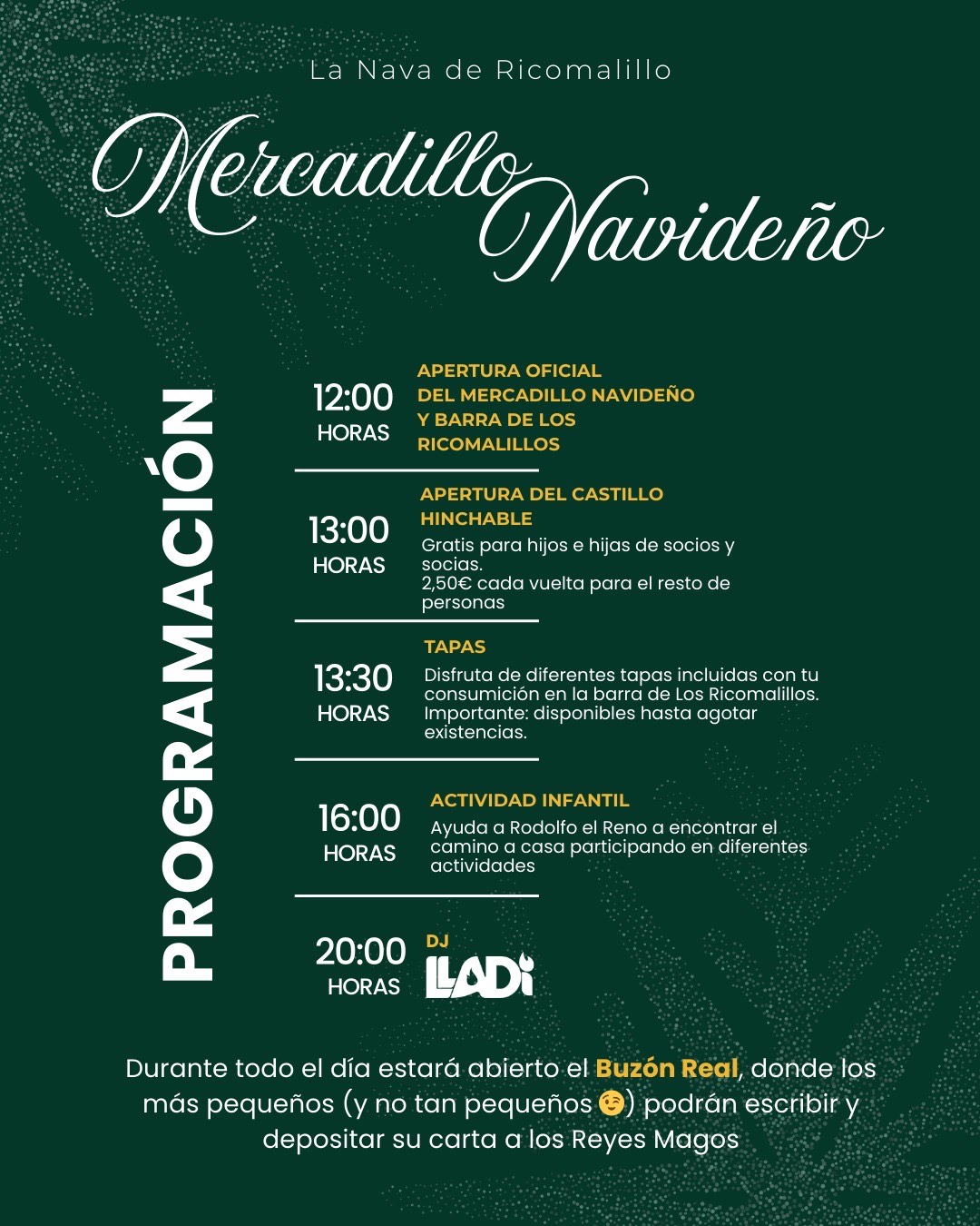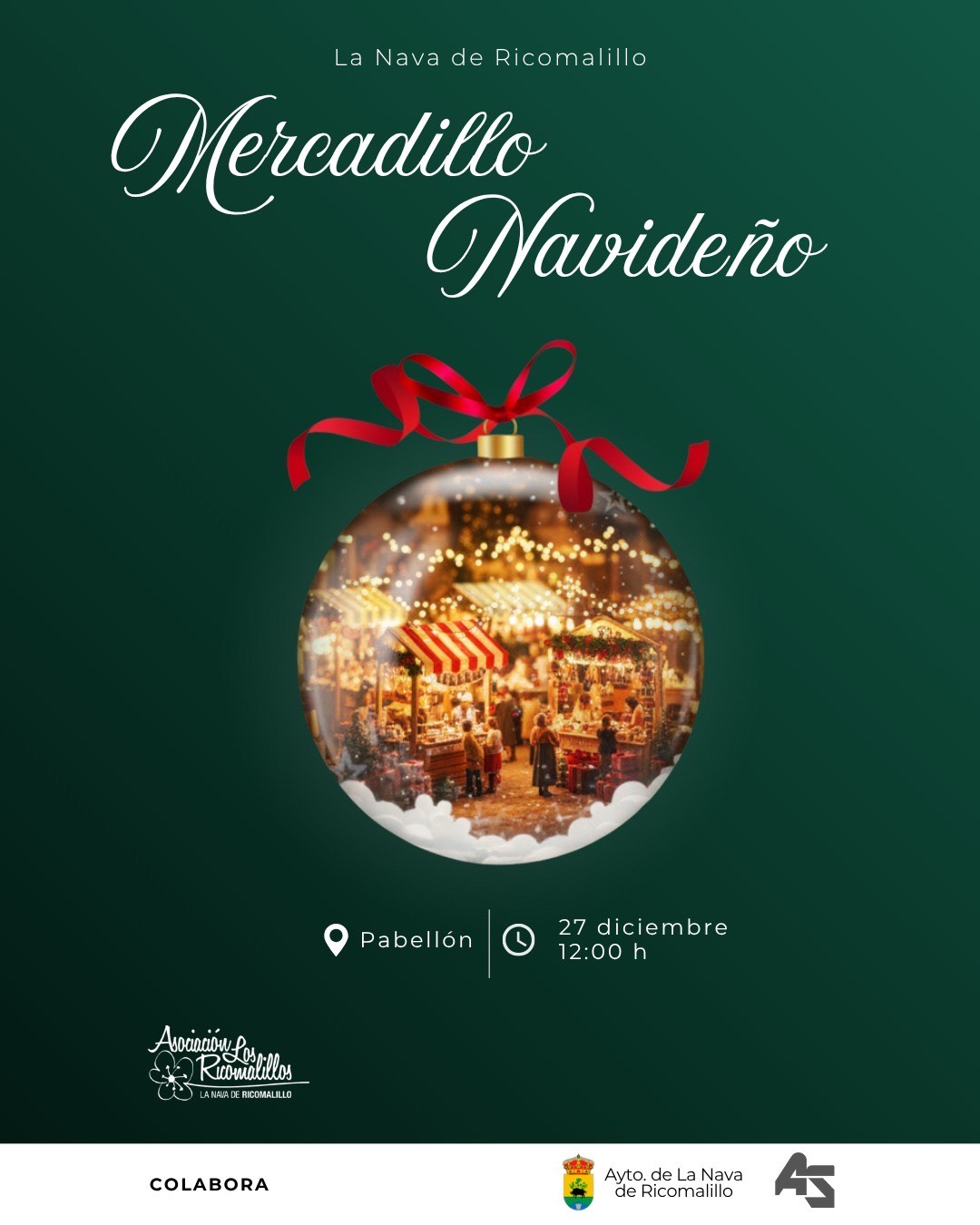 LA ASOCIACIÓN LOS RICOMALILLOS, EN COLABORACIÓN CON EL AYUNTAMIENTO DE LA NAVA DE RICOMALILLO, ORGANIZA ESTE SÁBADO, 27 DE DICIEMBRE EL I MERCADILLO NAVIDEÑO DE LA NAVA DE RICOMALILLO (TOLEDO), UNA CITA PENSADA PARA DINAMIZAR EL MUNICIPIO, APOYAR AL COMERCIO LOCAL Y OFRECER UNA JORNADA DE CONVIVENCIA PARA VECINOS Y VISITANTES EN ESTAS FECHAS TAN SEÑALADAS.