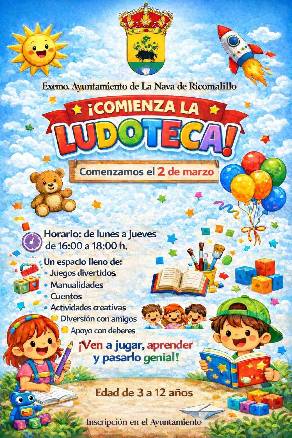 SE INFORMA A TODOS LOS VECINOS QUE EL PRÓXIMO LUNES, 2 DE MARZO, DE 16:00 A 18:00 HORAS, DARÁ COMIENZO LA LUDOTECA MUNICIPAL EN EL CENTRO CÍVICO, DIRIGIDA A TODOS LOS NIÑOS Y NIÑAS PREVIAMENTE INSCRITOS.
