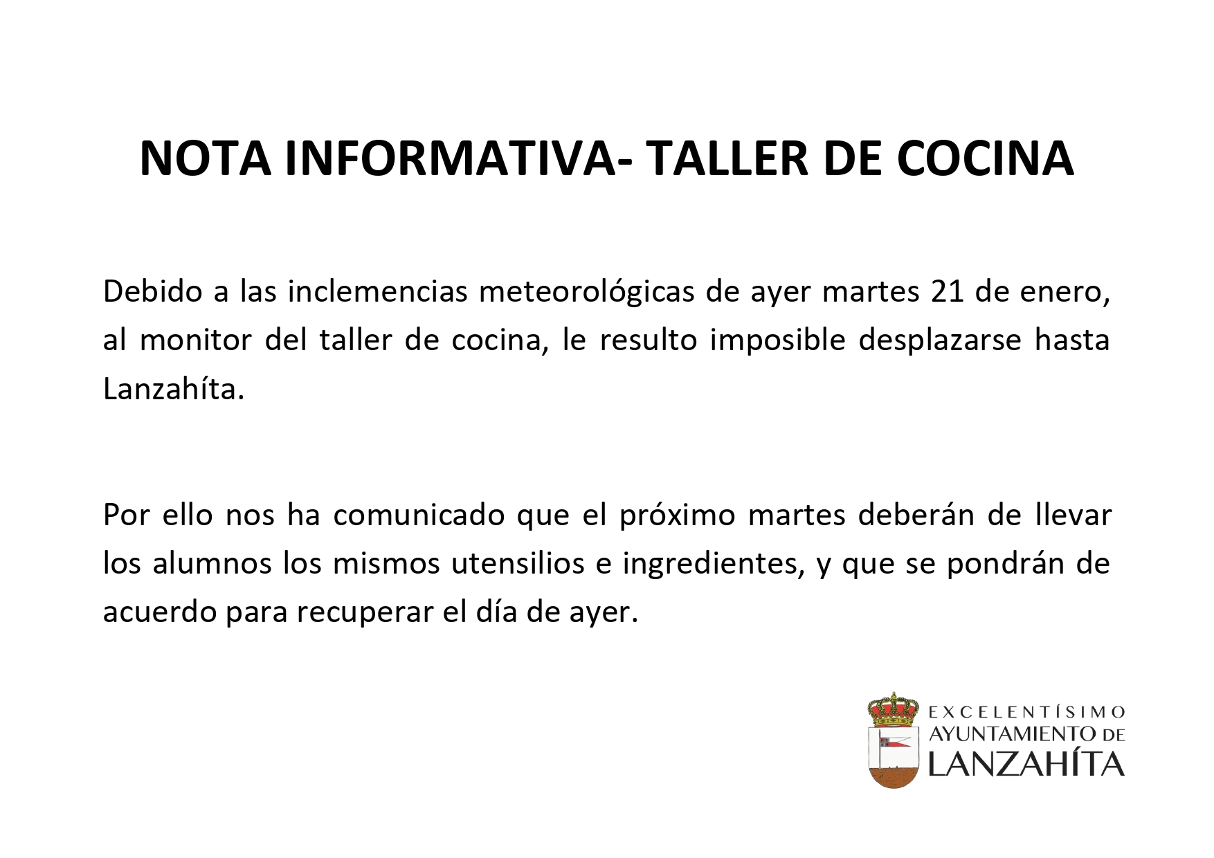 Nota informativa- Taller de cocina.