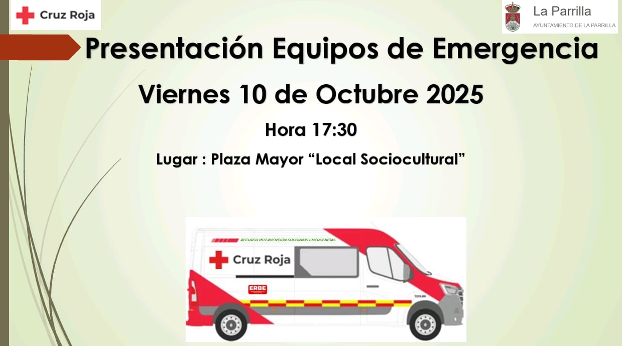 ESTE VIERNES,, DÍA 10 DE OCTUBRE, EN LA PLAZA MAYOR DE LA PARRILLA , CRUZ ROJA COMARCAL PRESENTARÁ LOS EQUIPOS DE EMERGENCIA QUE DARÁN SERVICIO A TODA LA ZONA.
