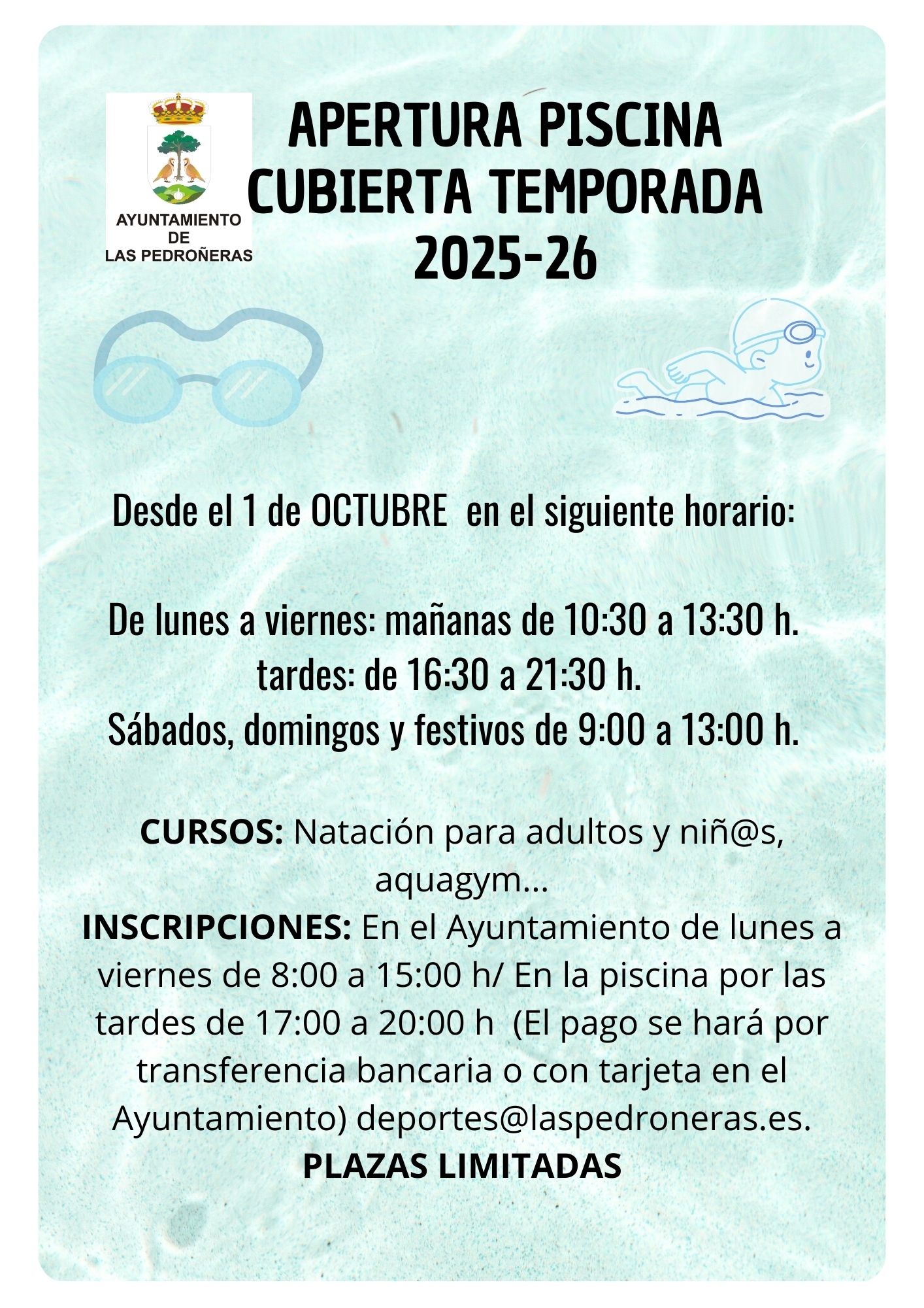 INSCRIPCIONES: En el Ayuntamiento mañanas de lunes a viernes de 8:00 a 15:00 h/ En la piscina por las tardes de 17:00 a 20:00 h (El pago se hará por transferencia bancaria o con tarjeta en el Ayuntamiento). Info: deportes@laspedroneras.es. PLAZAS LIMITADAS