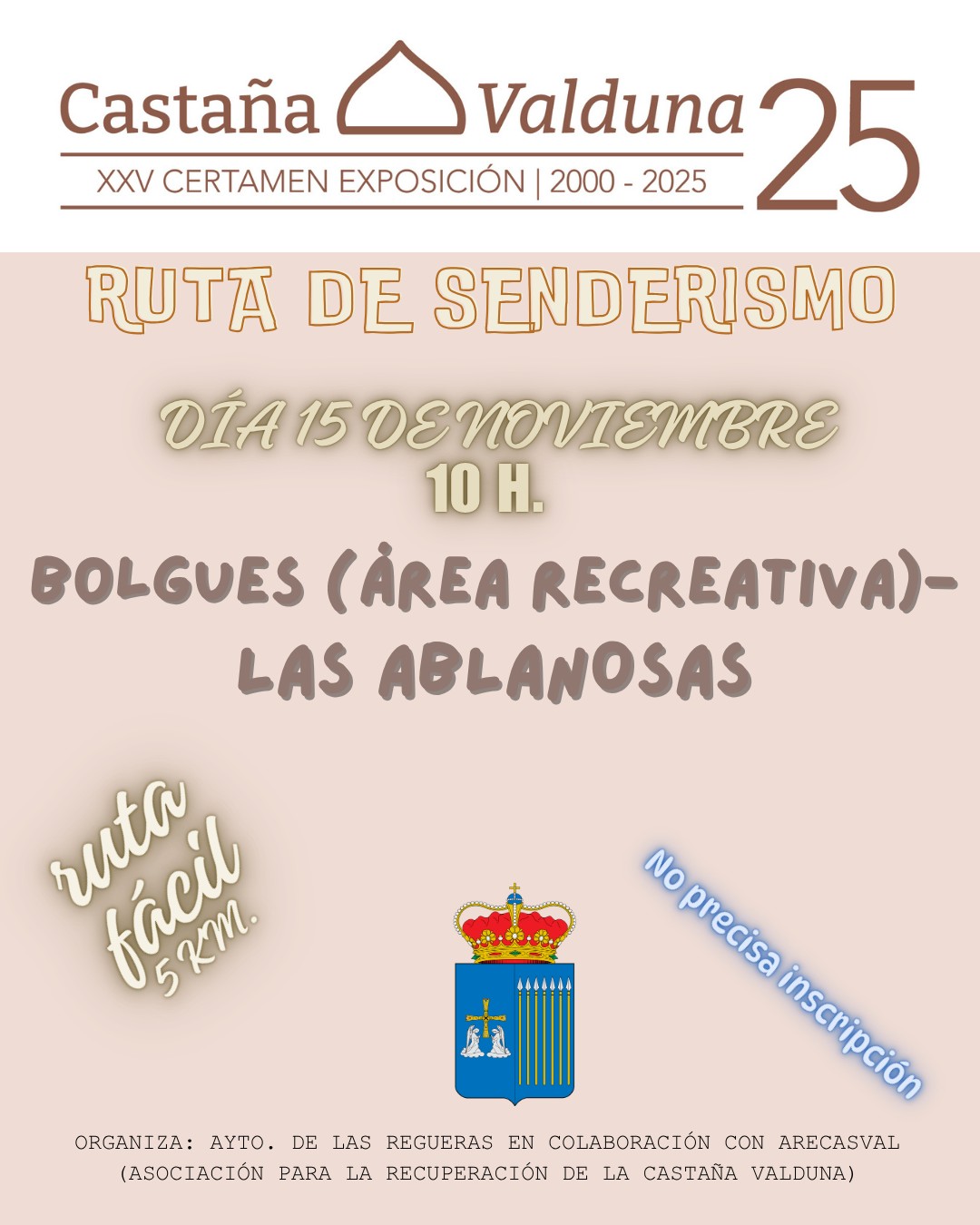 Los días 8 y 9 de noviembre de 2025 se celebrará el XXV Certamen-Exposición de la Castaña Valduna en la pista polideportiva cubierta del Colegio Público Príncipe de Asturias de Las Regueras.
