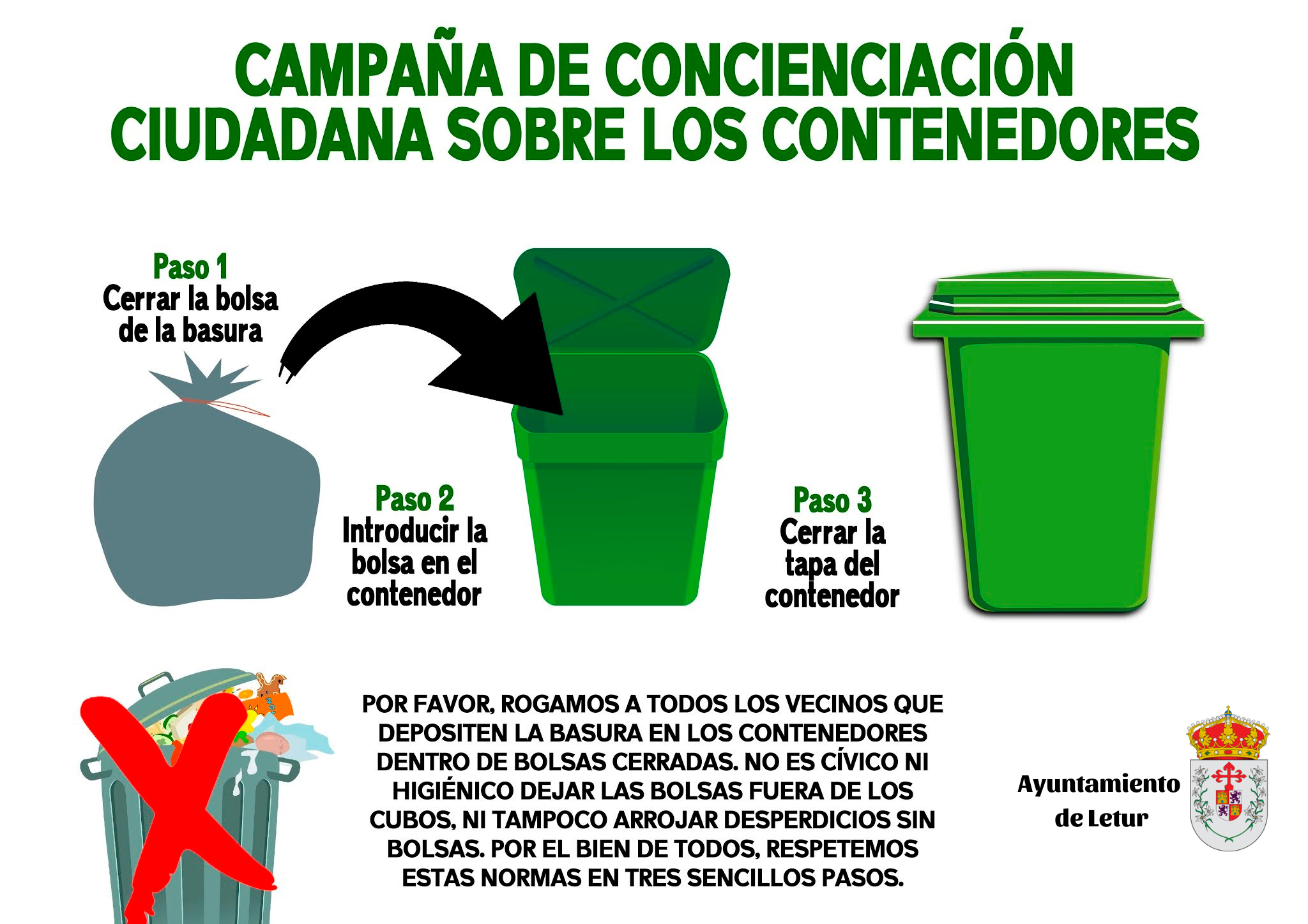 Por favor, rogamos a todos los vecinos que depositen la basura en los contenedores dentro de bolsas cerradas. No es cívico ni higiénico dejar las bolsas fuera de los cubos, ni tampoco arrojar desperdicios sin bolsas. Por el bien de todos, respetemos estas normas.