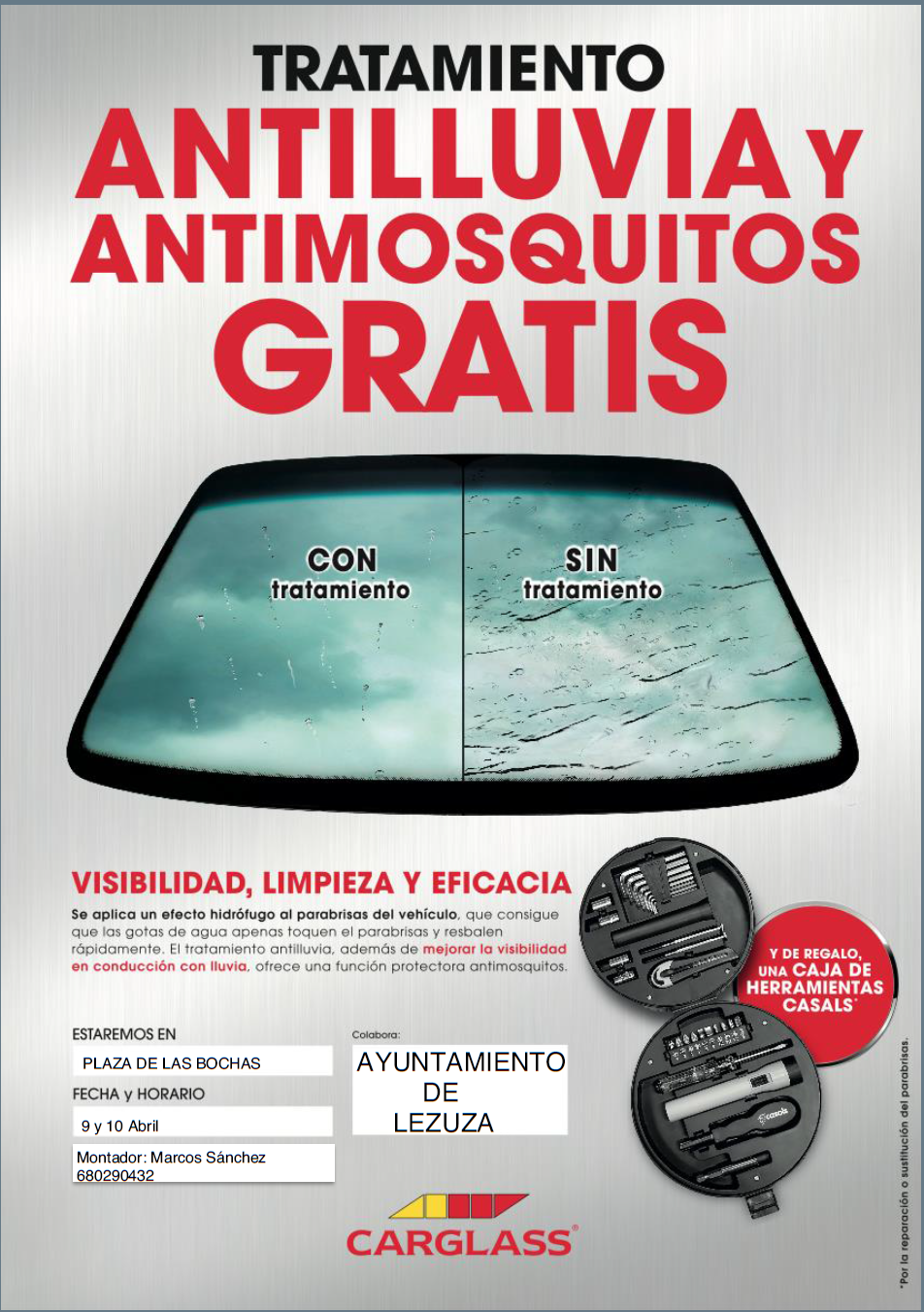 Los técnicos de Carglass estarán el 9 y 10 de Abril el la Plaza de las Bochas de Lezuza realizando una campaña de seguridad vial para asegurarse de que la luna de tu vehículo se encuentra en perfecto estado, y además os aplican GRATIS el tratamiento antilluvia