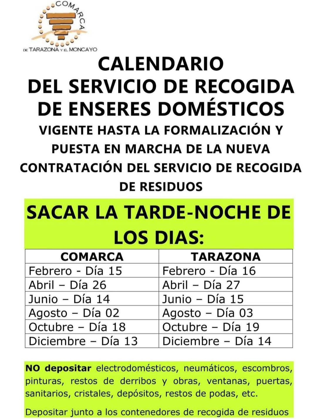 Se remite calendario del servicio de recogida de enseres domésticos para el año 2026 vigente hasta la formalización y puesta en marcha de la nueva contratación del servicio de recogida de residuos facilitado por la Comarca de Tarazona y el Moncayo.