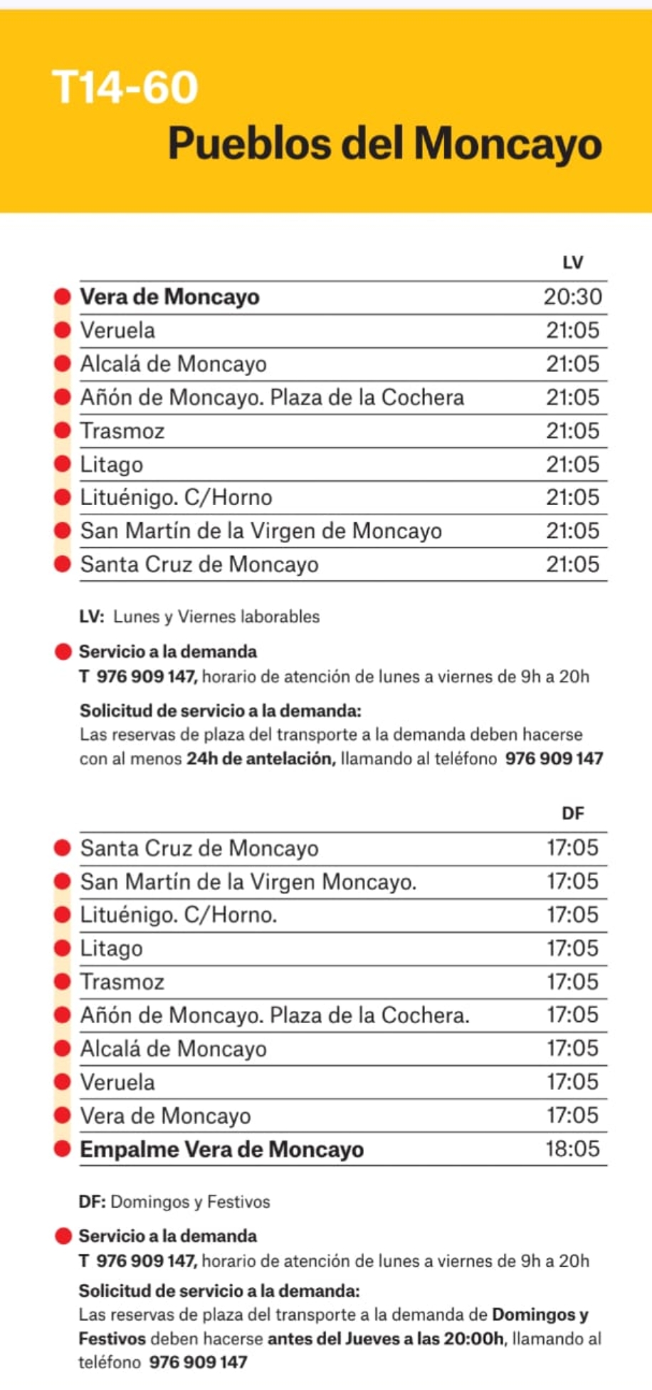El Ayuntamiento informa a todas las vecinas y vecinos sobre el funcionamiento del servicio de transporte a la demanda desde el pueblo hacia Tarazona, así como los servicios de domingos y festivos para enlazar con el autobús de Zaragoza.