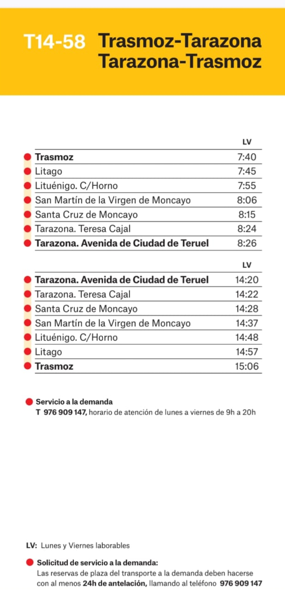 Informamos de los horarios definitivos del servicio de transporte Lituénigo - Tarazona y Lituénigo - Zaragoza.