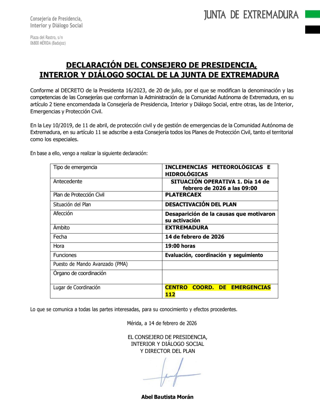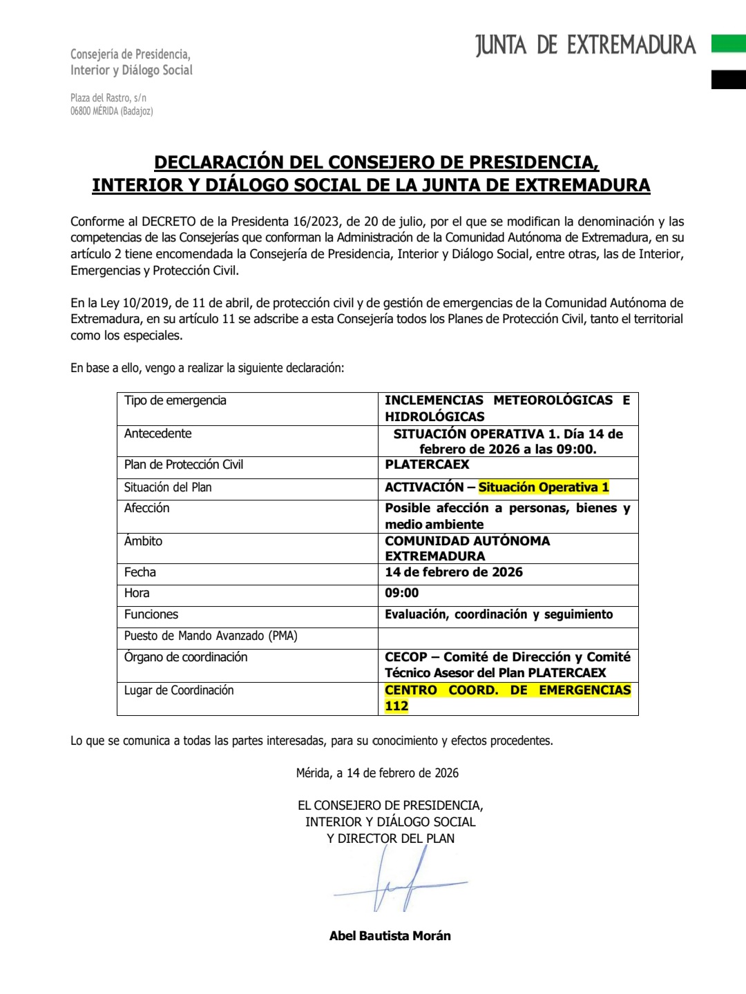 AMPLIACIÓN AEMET FMA Centro 1.1.2 ACTIVA ALERTA NIVEL NARANJA LLUVIAS a Zona Norte de Prov. Cáceres. Acumulado 12 horas: 80mm. De 06:00 a 23:59 del 7/02/26 Y ALERTA NIVEL NARANJA VIENTOS a zonas Vegas del Guadiana, Barros y Serena y Sur de Prov. Badajoz. Rachas:90 km/h. De 08:00 a 18:00 del 7/02/26. Se mantienen activadas las ALERTAS AMARILLAS por VIENTO, LLUVI y NIEVE comunicadas esta mañana. -