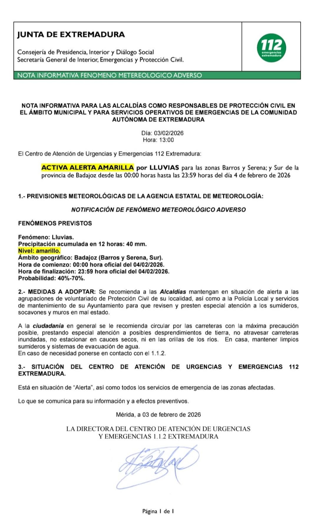 AVISO AEMET FMA POR LLUVIA. CENTRO 112 ACTIVA ALERTA NIVEL AMARILLO EN LAS ZONAS BARROS Y SERENA; Y SUR DE LA PROVINCIA DE BADAJOZ. PRECIPITACIÓN ACUMULADA EN 12 HORAS: 40 l/M2 DESDE LAS 00:00 HORAS A LAS 23:59 HORAS DEL DÍA 04/02/2026. MÁS INFORMACIÓN EN WEB 112 Y AEMET. CENTRO112. -