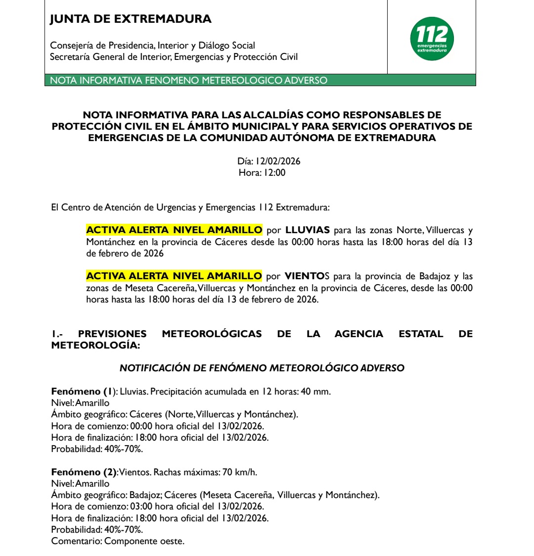 Aviso AEMET FMA LLUVIA Y VIENTO. Centro 112 amplia ALERTA A NIVEL NARANJA por LLUVIAS para Norte Prov. Cáceres. ALERTA AMARILLA LLUVIAS Villuercas y Montánchez, Tajo y Alagón y Meseta Cacereña Prov. Cáceres. Acumulado en 12h: 40mm. De 00:00h a 18:00h del día 5/02/26. ALERTA AMARILLA LLUVIAS Barros y Serena y Sur Prov. Badajoz. Acumulado 40mm hasta las 12:00h. del 5/02/26. Amplía ALERTA NIVEL AMARILLO VIENTOS Rachas:80 km/h para toda Extremadura -