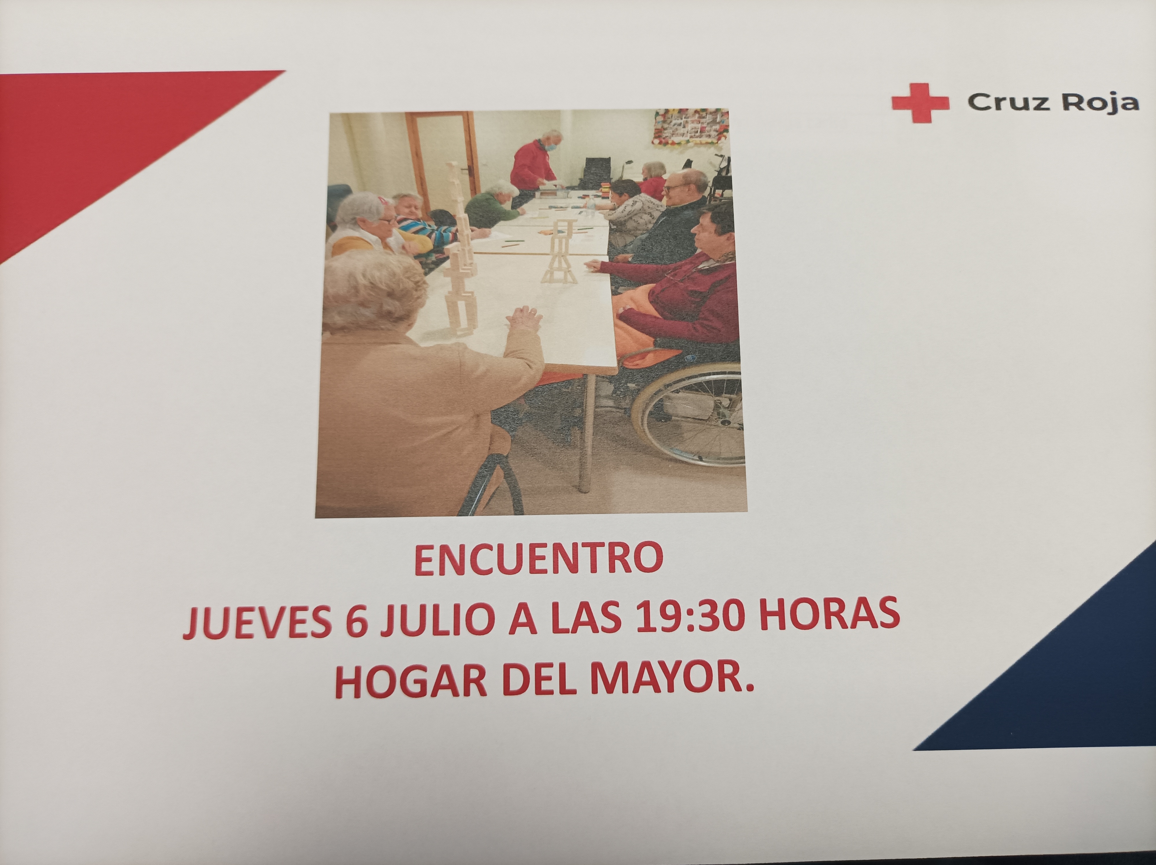Cruz Roja junto con sus voluntarios celebrará un encuentro el día 6 de julio en el hogar de mayores. No faltéis.
