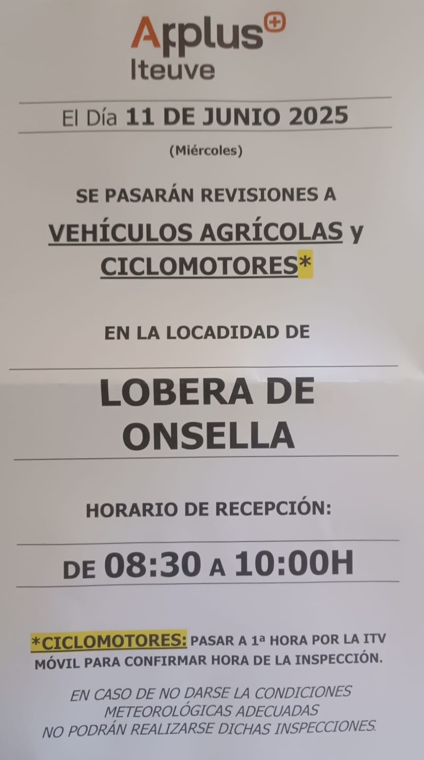 Adjunto remitimos el cartel informativo, para comunicar que el día 11 de JUNIO (miércoles), la empresa Applus Iteuve se desplazará a nuestro pueblo para realizar las inspecciones técnicas a los