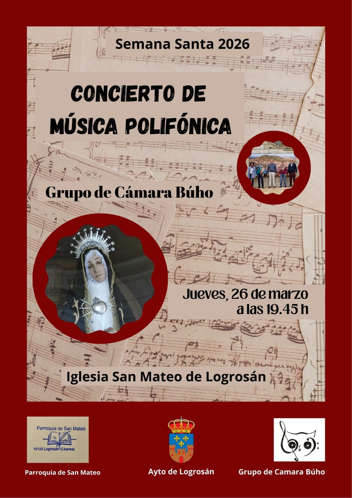 El jueves, 26 de marzo a las 19:45 h tendrá lugar en la Iglesia de San Mateo un concierto de música polifónica a cargo del Grupo de Cámara Búho, después de la misa.