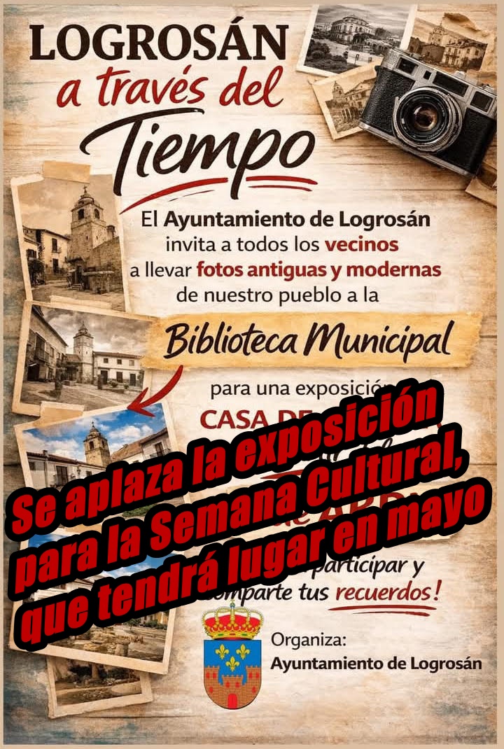 📢 Se informa que la exposición de fotografías "Logrosán a través del tiempo" queda aplazada hasta la semana cultural que tendrá lugar en el mes de mayo.