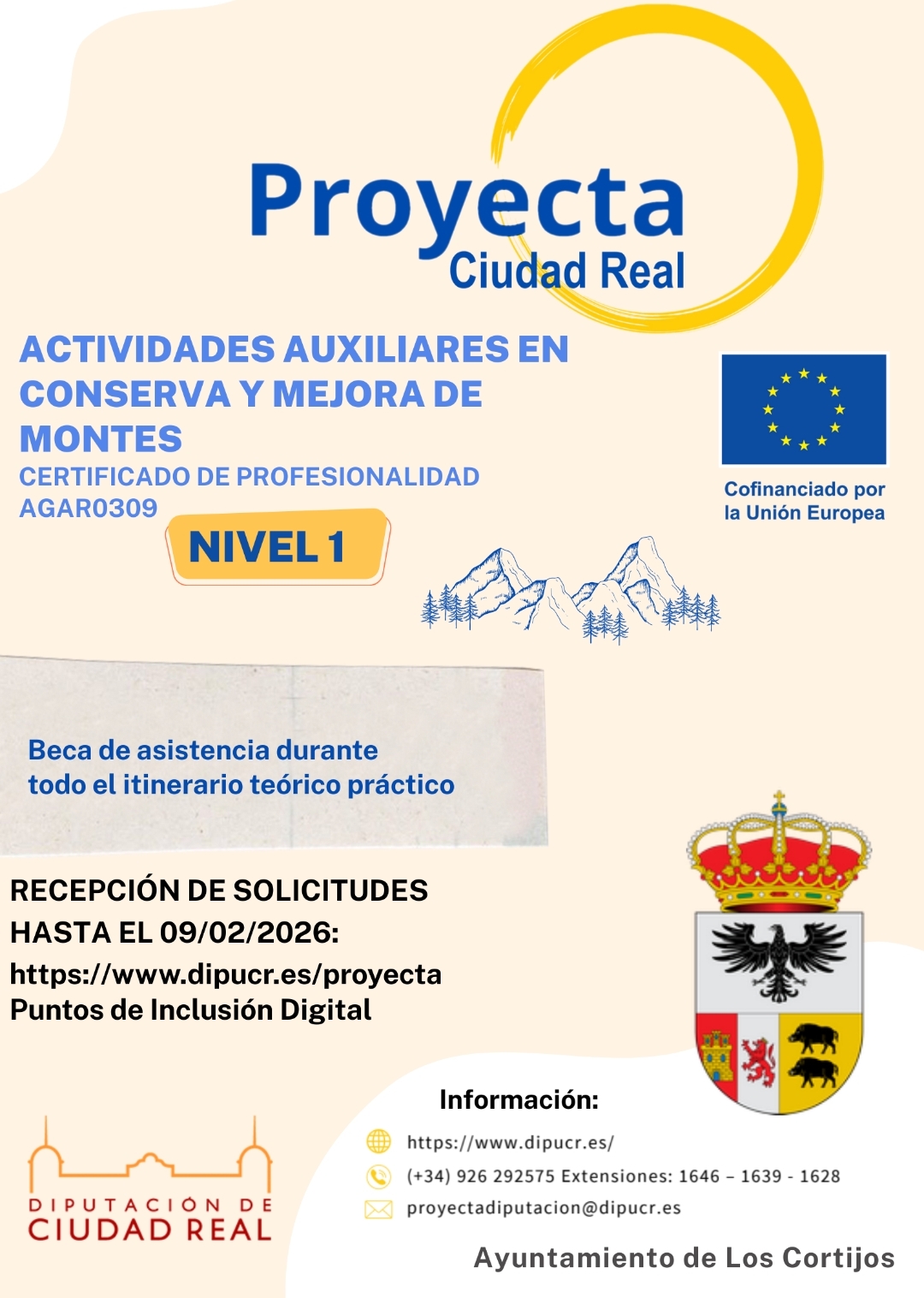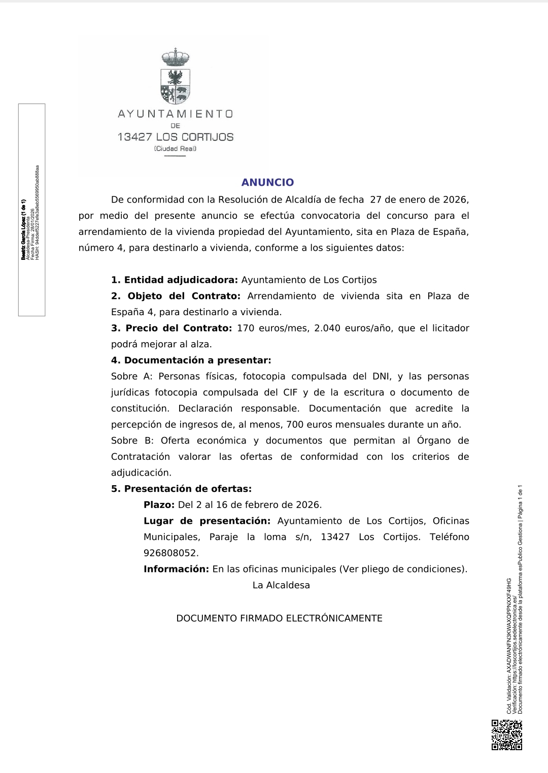 LOS INTERESADOS PODRÁN PRESENTAR SU SOLICITUD PARA PARTICIPAR EN EL PROCESO SELECTIVO DEL 2 AL 8 DE MARZO DE 2026, AMBOS INCLUSIVE, DE CONFORMIDAD CON LO ESTABLECIDO EN LAS BASES DE LA CONVOCATORIA. LAS BASES ESTARÁN A DISPOSICIÓN DE LOS INTERESADOS EN LA SEDE ELECTRÓNICA Y EN EL TABLÓN DE ANUNCIOS DEL AYUNTAMIENTO DE LOS CORTIJOS.