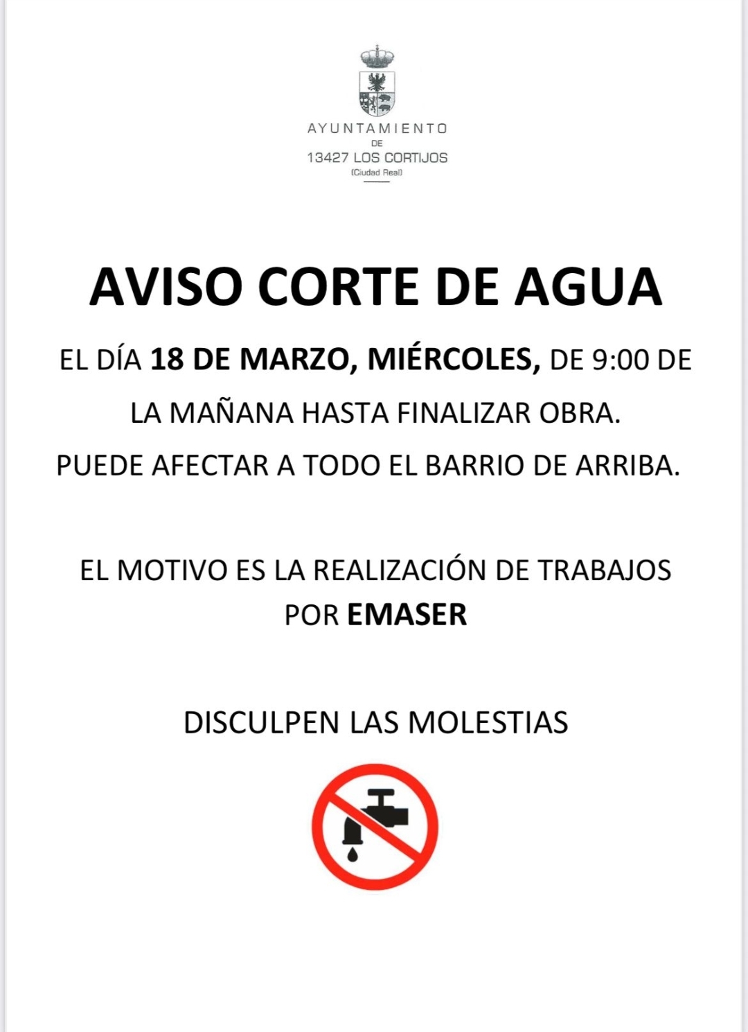 Con motivo de las obras que se están realizando de cambio de tuberías y con el fin de realizar las conexiones, el miércoles, a partir de las 9:00 h. de la mañana y hasta que finalicen las obras, habrá cortes de agua que podrán afectar a todo el barrio de arriba.