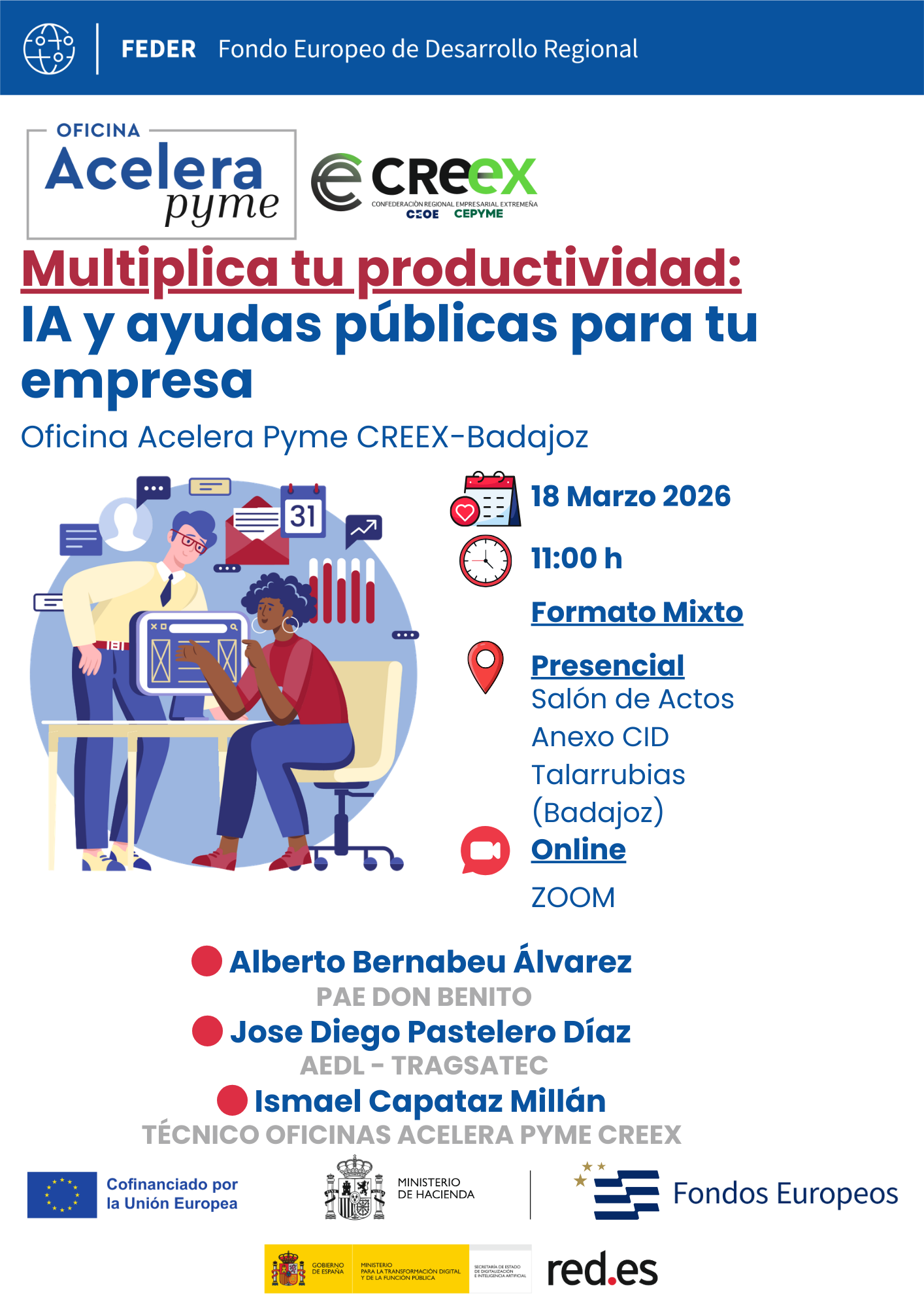 Mancomunidad de Municipios Siberia informa que se va a realizar una jornada llamada MULTIPLICA TU PRODUCTIVIDAD: IA Y AYUDAS PUBLICAS PARA TU EMPRESA desde la Oficina Acelera Pyme CREEX.