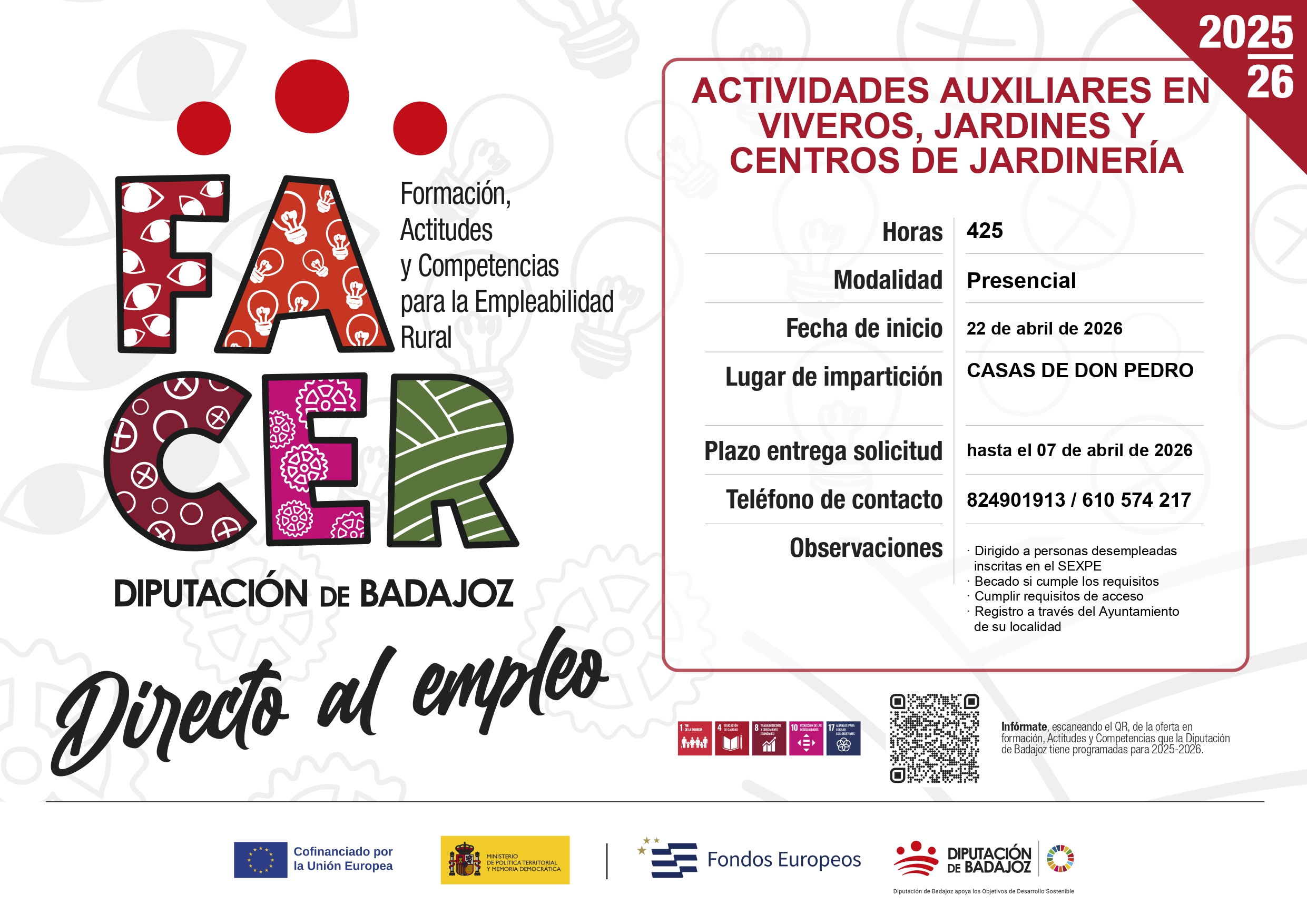 Desde Mancomunidad de Municipios Siberia informamos que en Casas de Don Pedro se va a impartir el CURSO DE ACTIVIDADES AUXILIARES EN VIVEROS, JARDINES Y CENTROS DE JARDINERÍA.