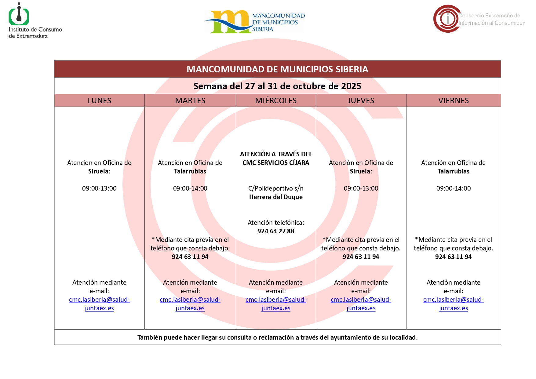 La Oficina de Atención al Consumidor estará en las siguientes localidades la semana del 27 al 31 de octubre de 2025