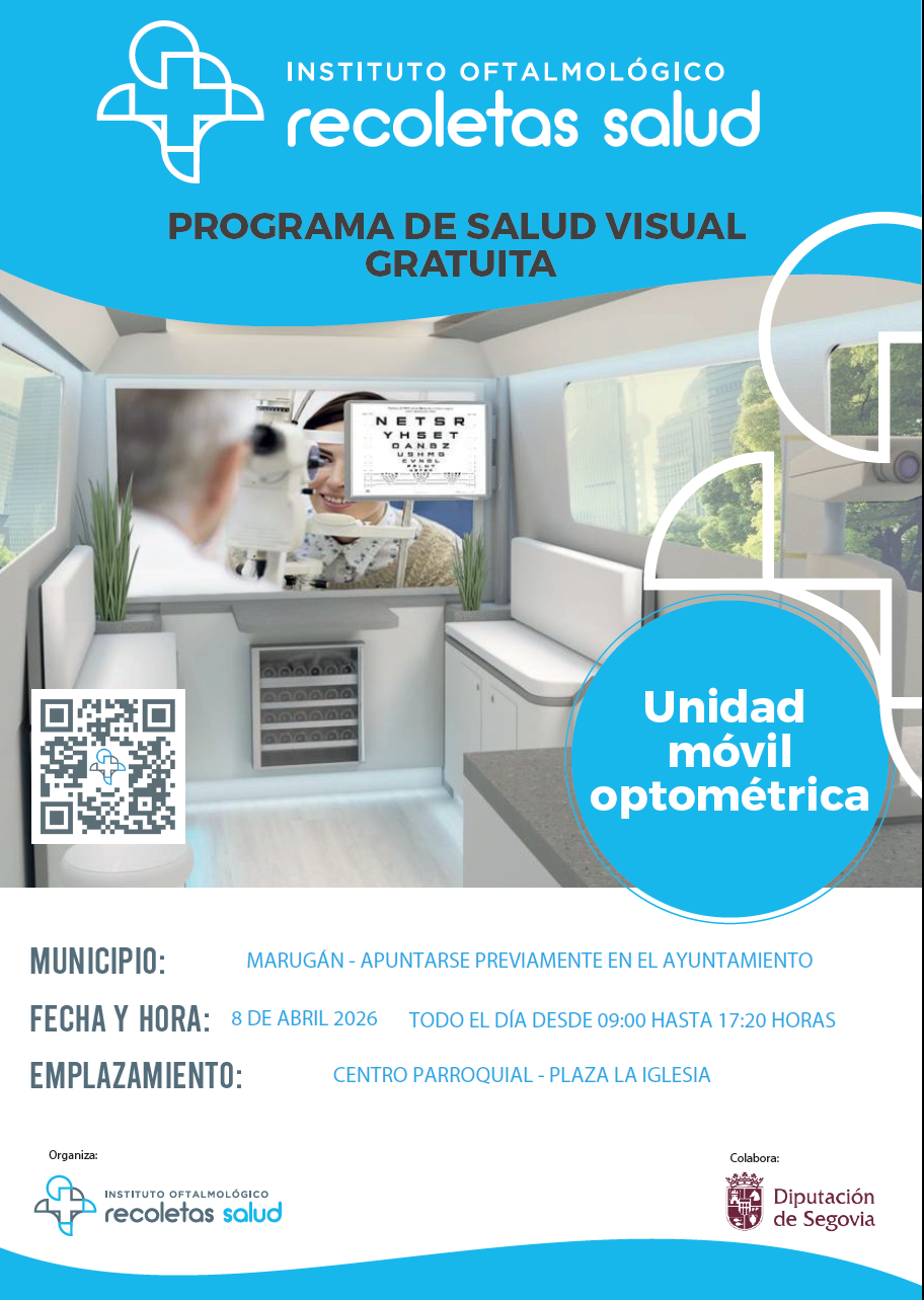 El próximo día 8 de abril de 09:00 a 17:20 horas, la unidad móvil de optometríca del Instituto Oftalmológico Recoletas Salud, en colaboración con la Diputación de Segovia, realizará una jornada de revisión visual en el Centro Parroquial de Marugán.