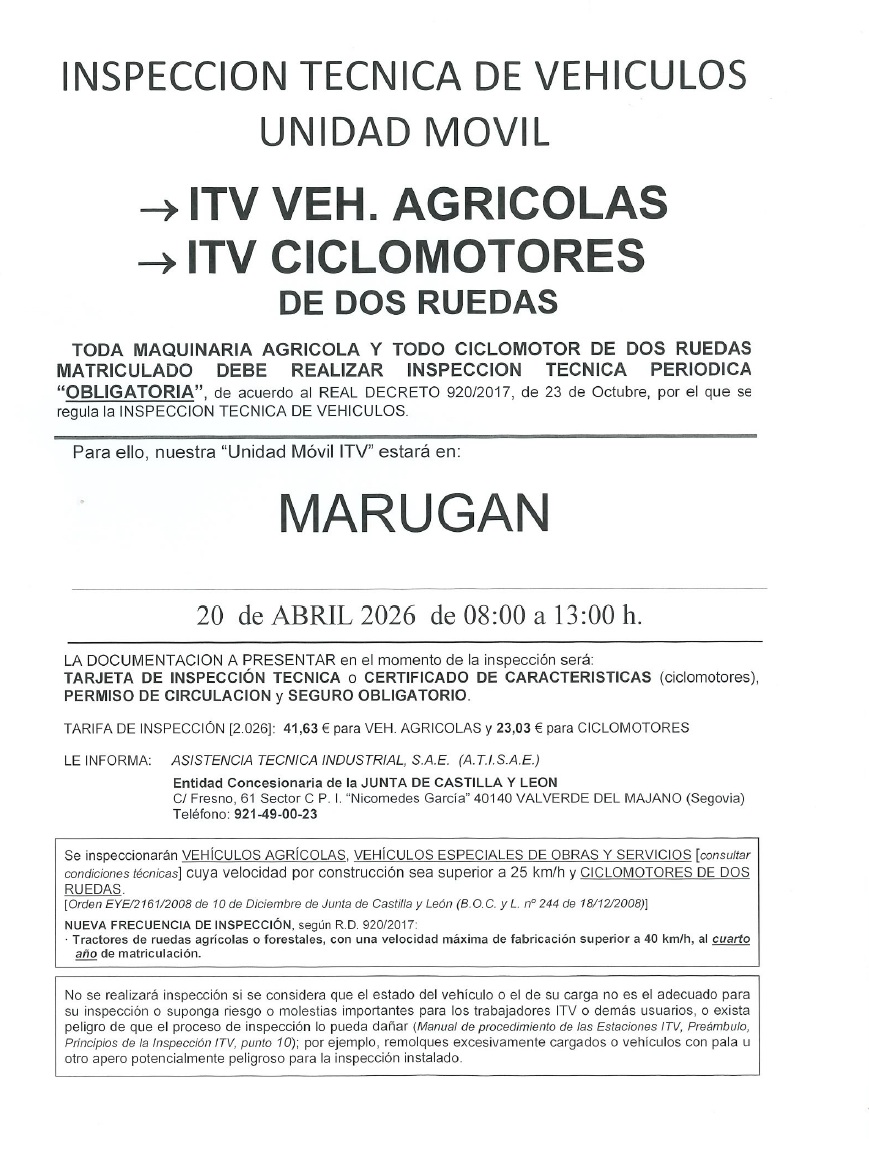 INSPECCIÓN TÉCNICA VEHÍCULOS UNIDAD MÓVIL El próximo 20 de Abril de 08:00 a 13:00 podrá realizarse la Inspección Técnica de Vehículos Agrícolas y Ciclomotores.