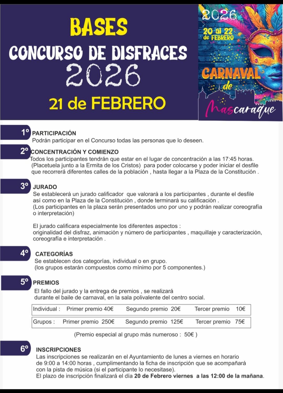 Desde el Ayuntamiento de Mascaraque queremos dar la enhorabuena a todas las personas ganadoras en las distintas categorías del Concurso de Carnaval 2026. ¡Gracias por vuestra creatividad, participación y por llenar nuestras calles de color y alegría! 🥳🎉