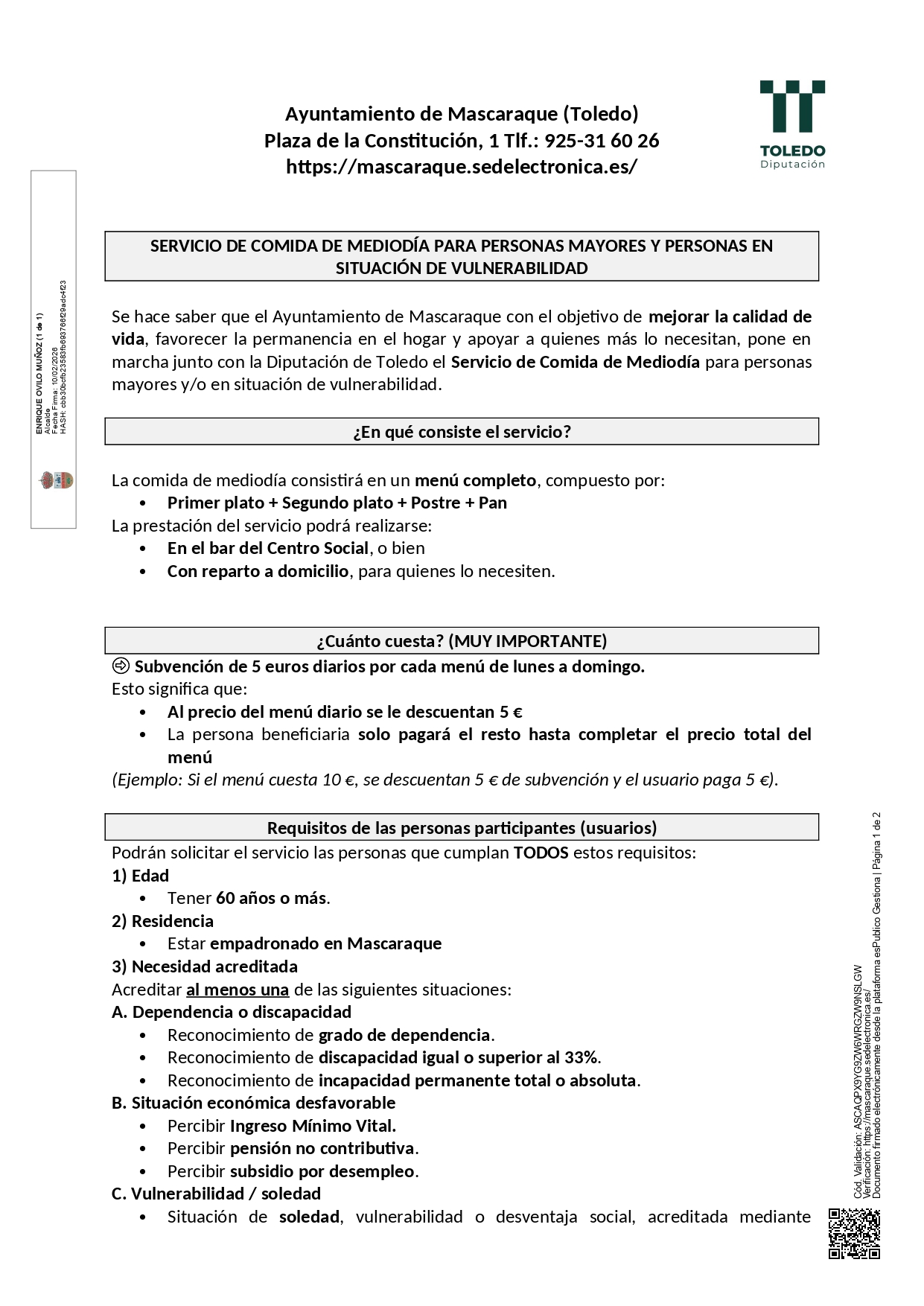 El Ayuntamiento de Mascaraque, en colaboración con la Diputación de Toledo, pone en marcha el Servicio de Comida de Mediodía dirigido a personas mayores y personas en situación de vulnerabilidad, con el objetivo de mejorar su calidad de vida y facilitar la permanencia en el hogar .