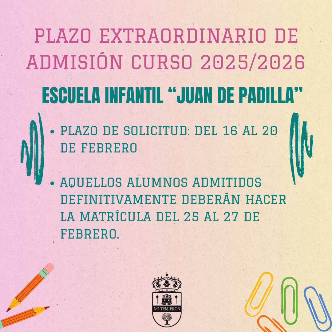📚 Apertura de plazo extraordinario de admisión para Nuevos Alumnos en la Escuela Infantil Juan de Padilla para el curso 2025 / 2026📚