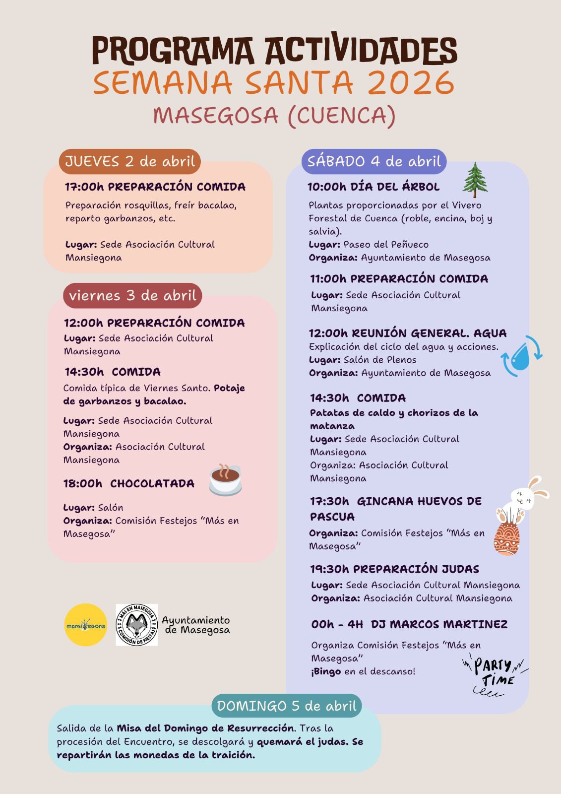 Adjuntamos el cartel informativo de las Actividades programadas para Semana Santa, tanto por la Asociación Cultural Mansiegona, la Comisión de Fiestas Más Masegosa y el Ayuntamiento.