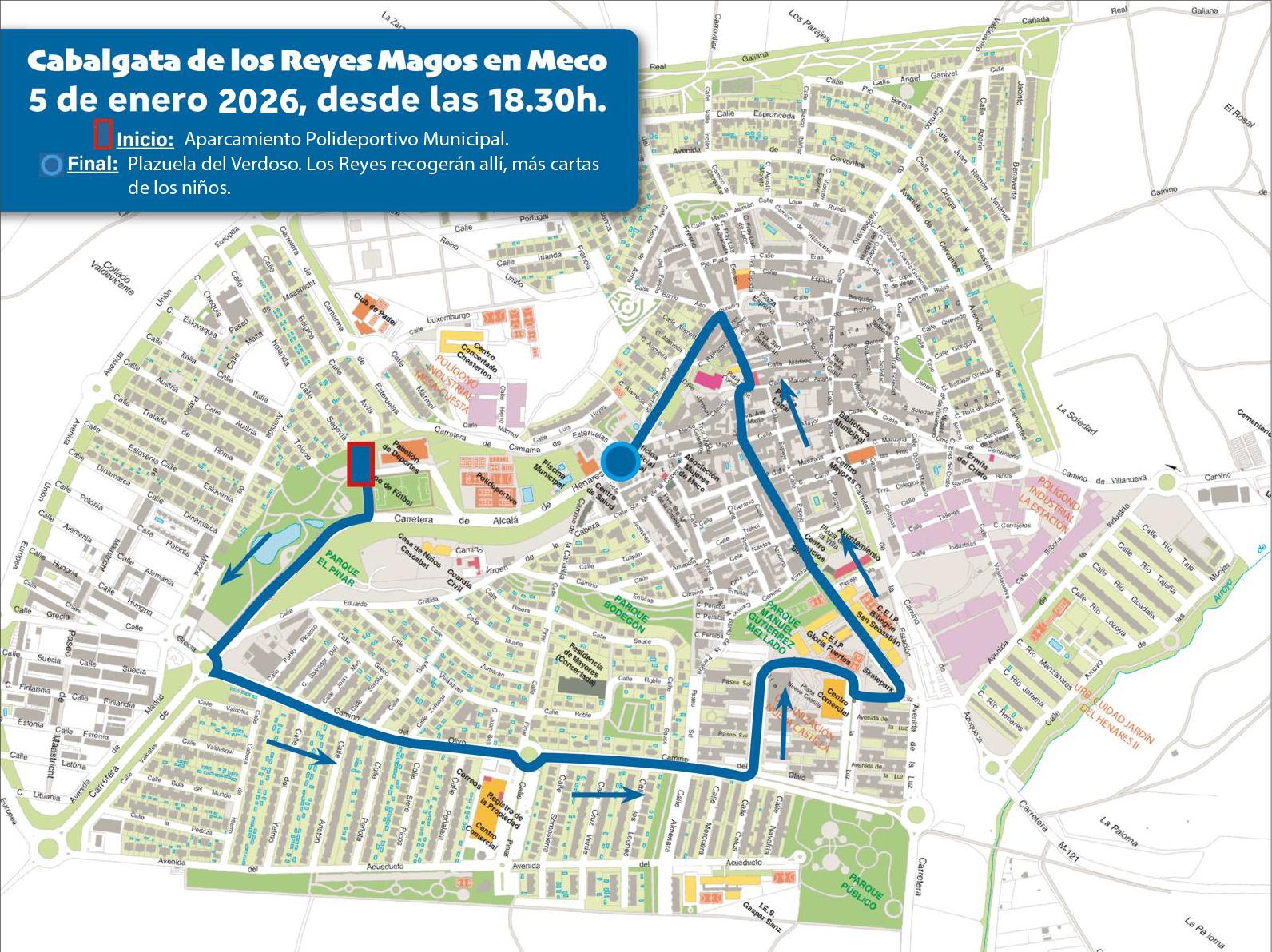 Desde el Pabellón Municipal de Deportes, los Reyes Magos iniciarán su desfile hasta la rotonda de la carretera de Alcalá con el Camino del Olivo, seguirán recto hasta girar hacia el Paseo del Sol, continuarán por la recién remodelada calle d(...)