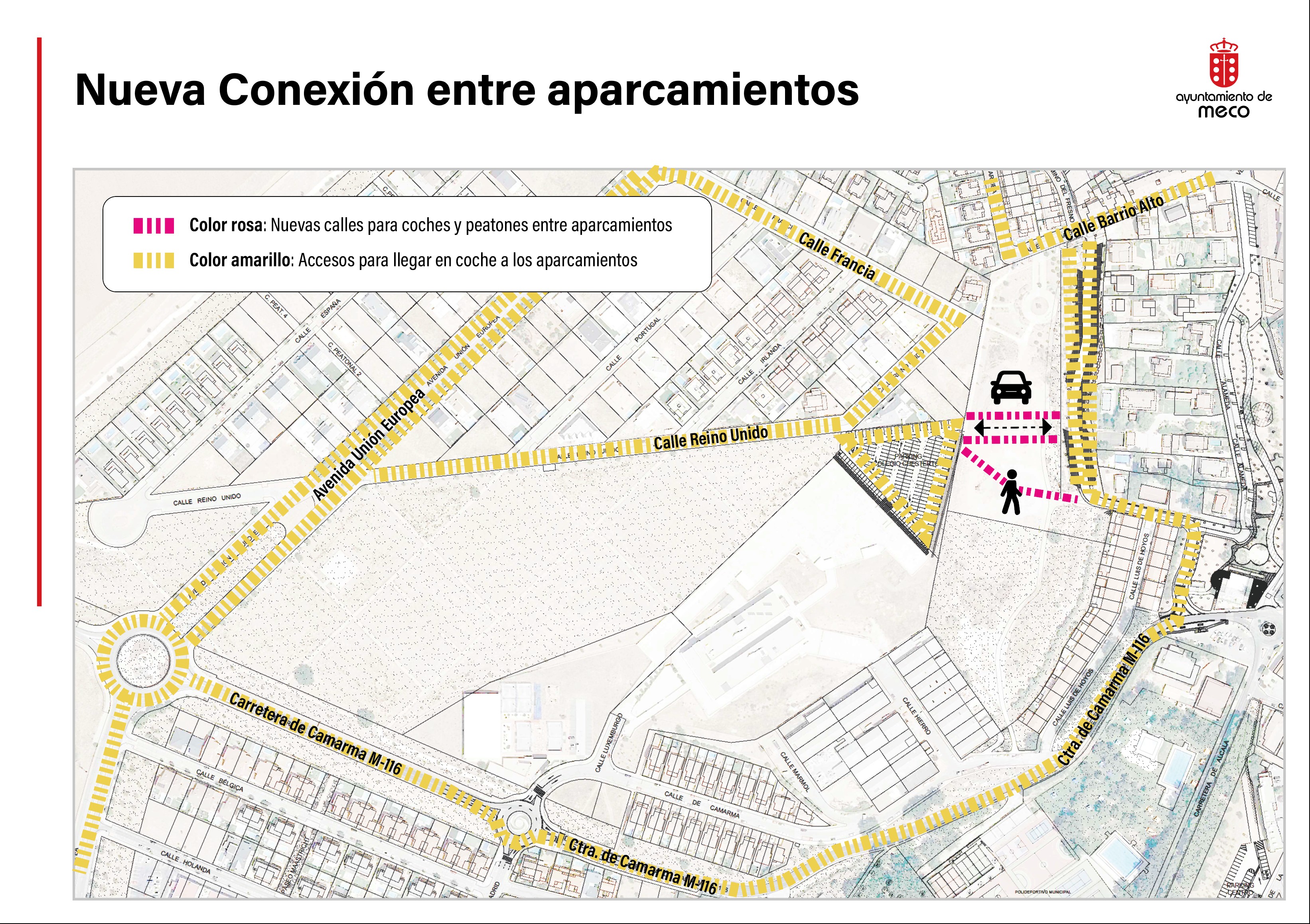 Acercarnos al centro de Meco en vehículo ya es más fácil. Lo es gracias a las obras que acabamos de realizar y que unen el aparcamiento de la calle Reino Unido con el aparcamiento del Verdoso.