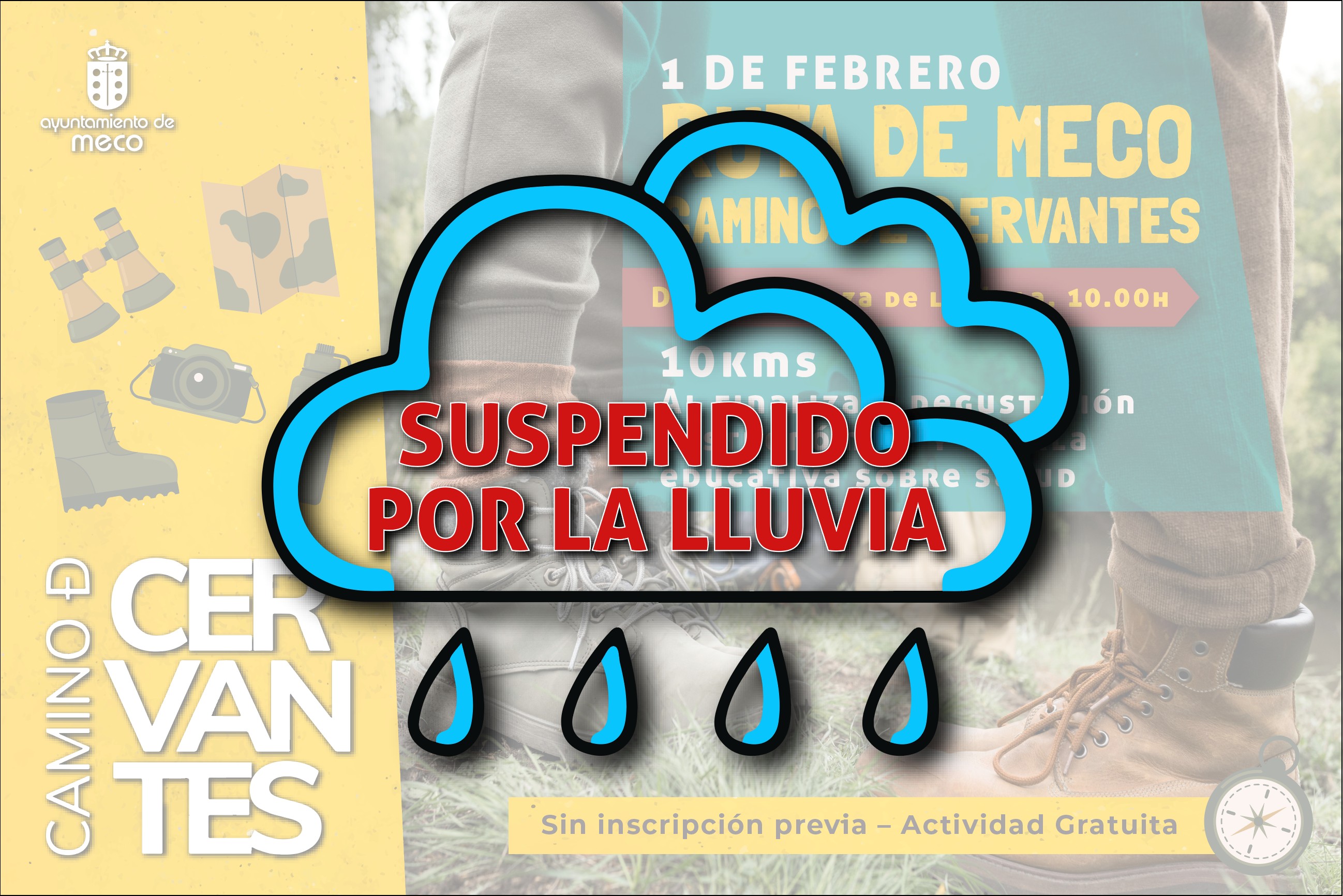 Febrero iba a empezar en Meco con un planazo: la ruta del Camino de Cervantes que todos los años suscita el interés de miles de vecinos. En esta ocasión, en este 2026, las intensas lluvias y las previsiones que tenemos para el domingo, 1 de febrero, nos obligan a suspender la actividad y todo lo que estaba asociado a ella.