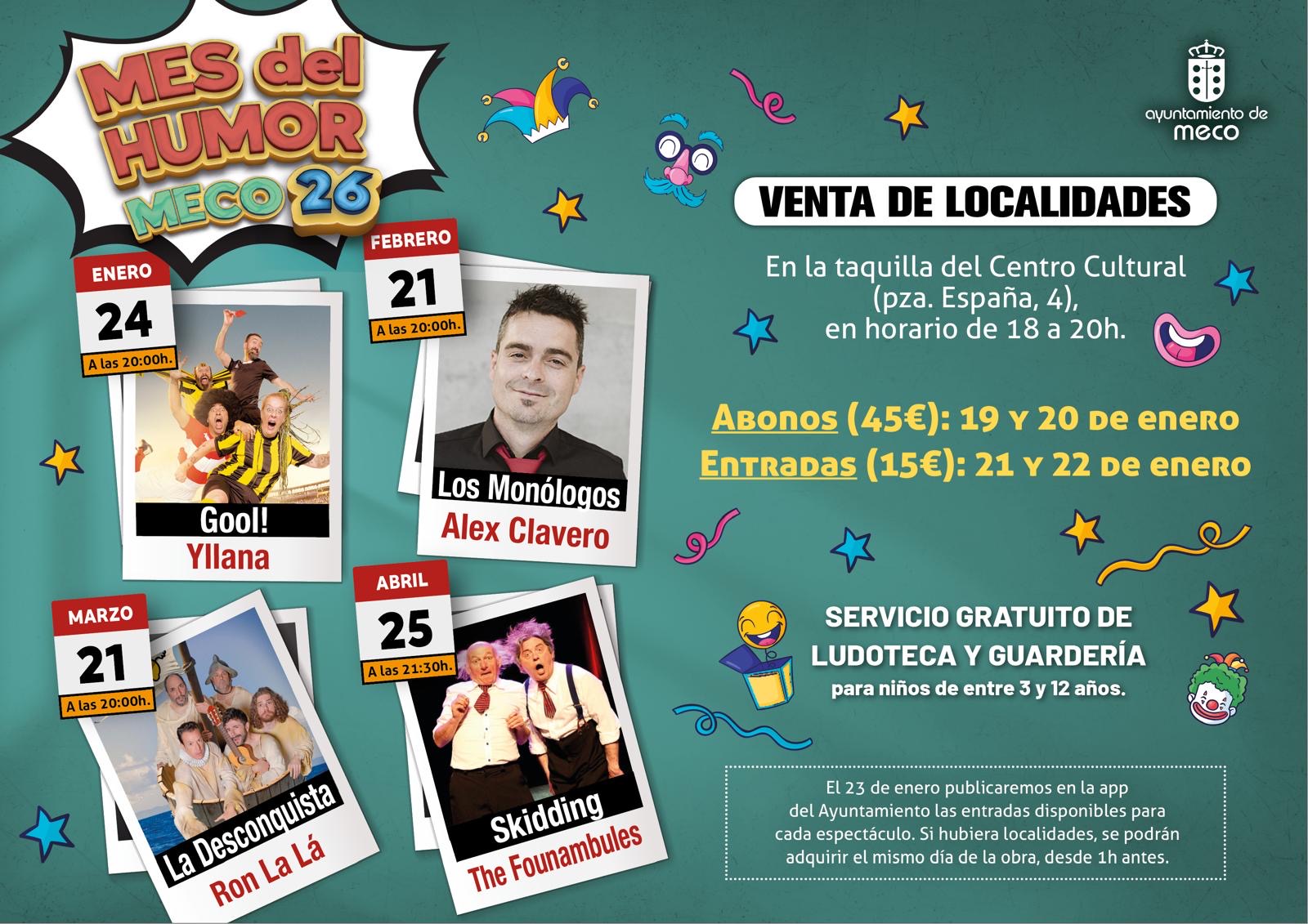 Ya está todo listo para troncharnos de risa en el festival cultural que inunda de carcajadas el Centro Cultural de Meco. Se trata del Mes del Humor, una cita imprescindible que este año traerá a nuestra localidad a Yllana, Alex Clavero, Ron La Lá y The Founambules. Un cartel de lujo para un certamen que cuelga siempre el cartel de "No hay entradas".