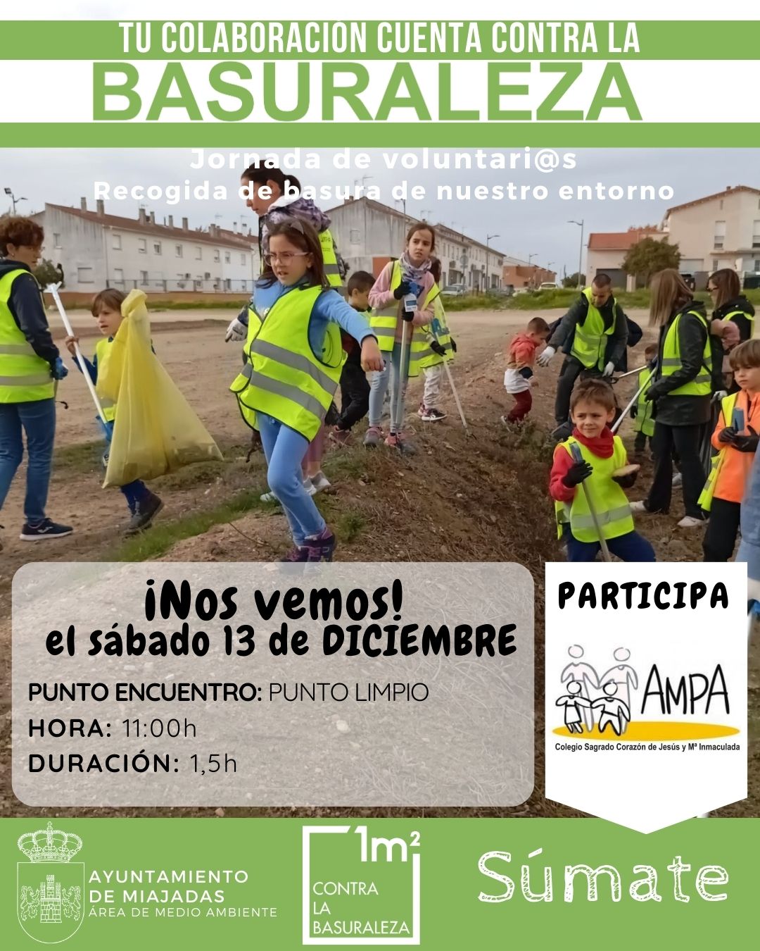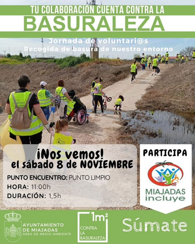 El Ayuntamiento de Miajadas, desde el Área de Medio Ambiente, vuelve a organizar una nueva jornada de recogida de residuos bajo el lema «MIAJADAS, contigo limpia», y será este sábado, 8 de noviembre. El objetivo de esta recogida de residuos es concienciar y movilizar a la ciudadanía para mantener los espacios naturales libres de BASURALEZA.