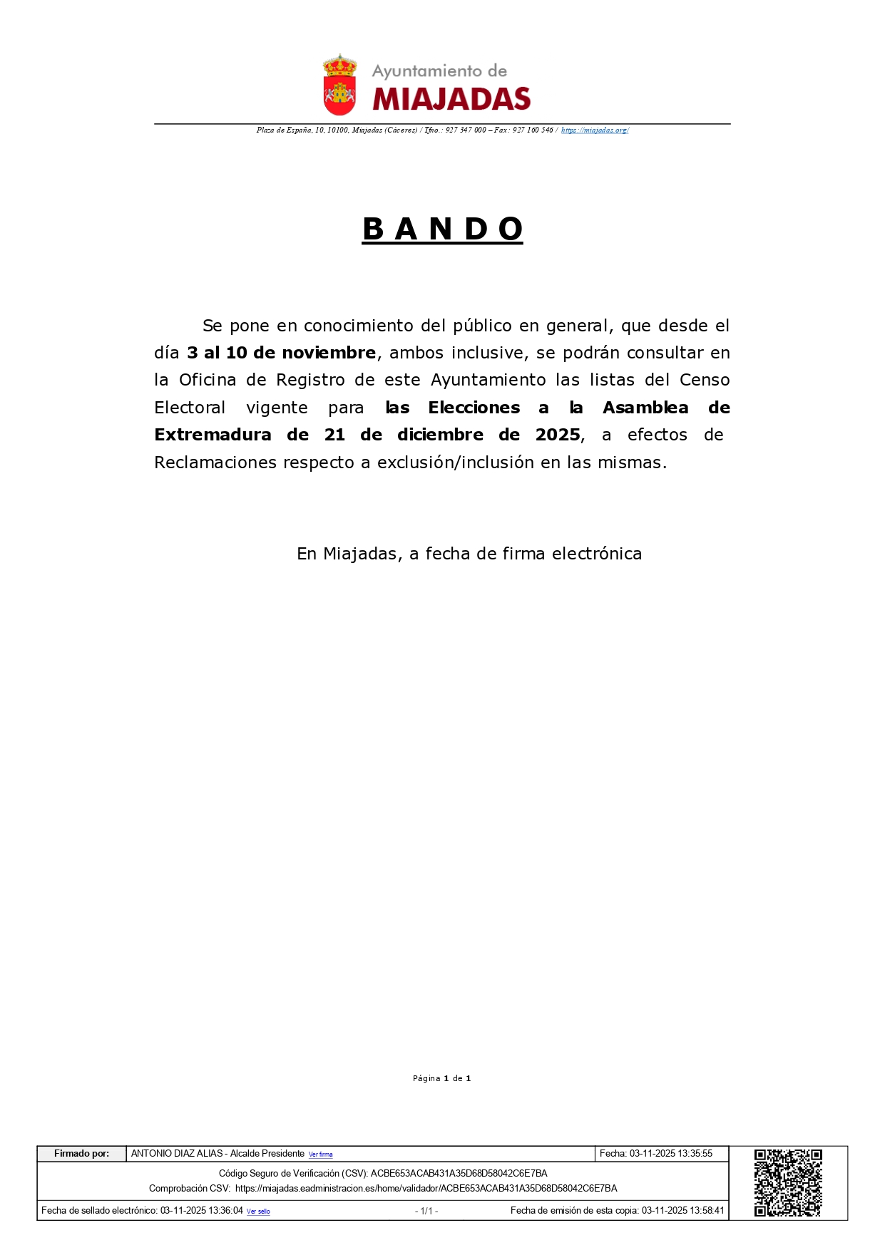 Bando: Consulta de las listas del Censo Electoral vigente para las Elecciones a la Asamblea de Extremadura de 21 de diciembre de 2025