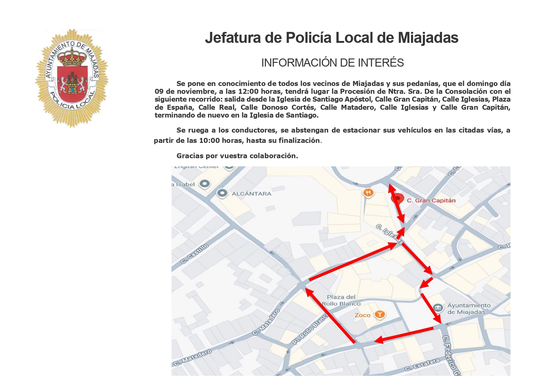Desde la Jefatura de la Policía Local se emite nota informativa (adjunta arriba) en torno a la celebración, este domingo, 9 de noviembre, de la Procesión en honor a Ntra. Sra. de la Consolación: Para el organizado y seguro desarrollo de la misma, se ruega a los conductores de vehículos que no estacionen en las calles que integran el recorrido, concretamente entre las 10:00 horas del mismo día y hasta la finalización de dicha Procesión, agradeciendo de antemano la atención y colaboración. (...)