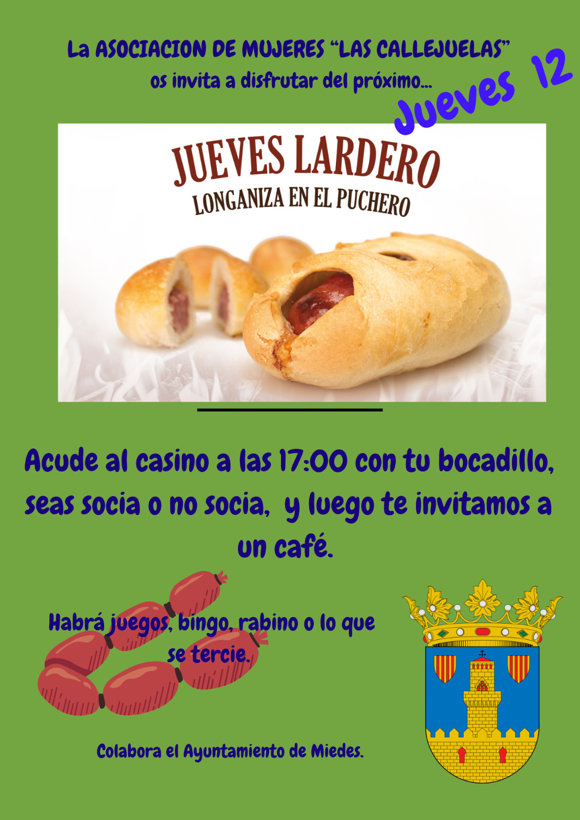LA ASOCICIACIÓN DE MUJERES "LAS CALLEJUELAS" os invita a disfrutar del próximo JUEVES LARDERO, LONGANIZA EN EL PUCHERO (jueves, 12)