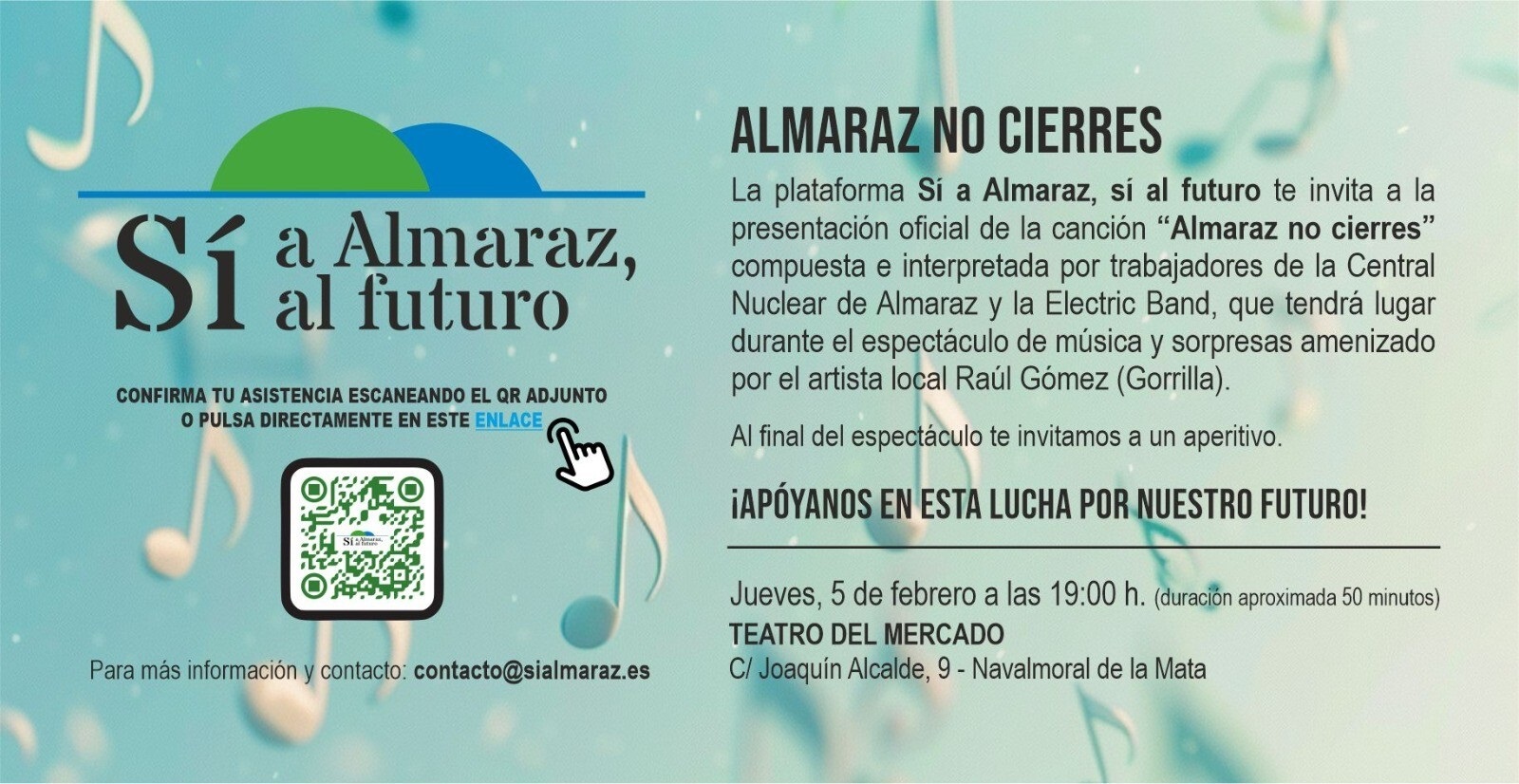 📢 La Junta Directiva de la plataforma "Sí a Almaraz, Sí al futuro" invita a la presentación oficial de la canción "Almaraz no cierres", compuesta e interpretada por trabajadores de la Central Nuclear de Almaraz y la Electric Band.
