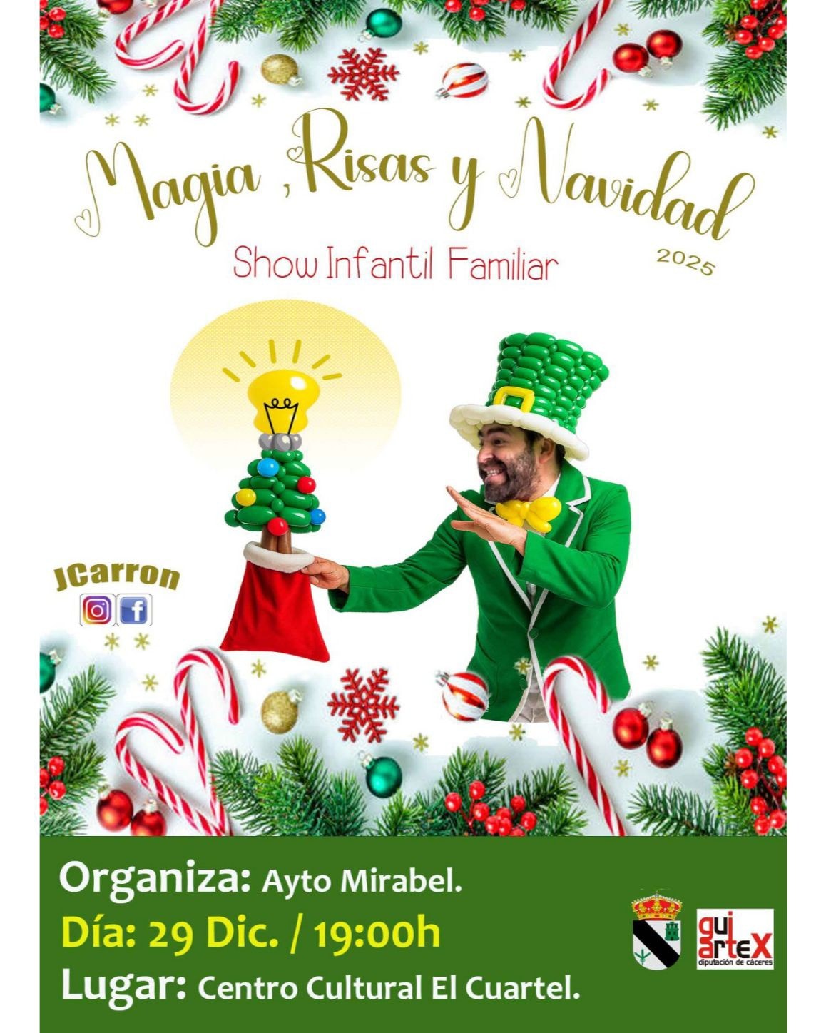 Se recuerda que esta tarde a las 19:00h en el Centro Cultural El Cuartel no os perdáis: "MAGIA, RISAS Y NAVIDAD". Un espectáculo familiar donde los más pequeños se convierten en protagonistas de una aventura llena de sorpresas, carcajadas y mucha ilusión. Mediante trucos sorprendentes, momentos participativos y ambiente festivo los niños y niñas descubrirán que la verdadera Magia de la Navidad está en compartir y sonreír juntos.