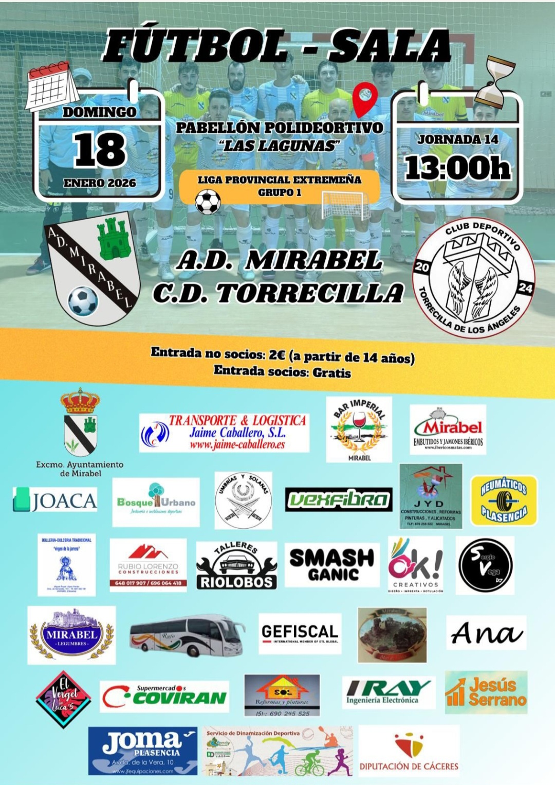 Se informa que el domingo a las 18:30h, la A.D. Mirabel jugará contra el equipo de G.V. Montehermoso el partido correspondiente a la 15ª Jornada de la Liga Provincial Extremeña de Fútbol Sala.
