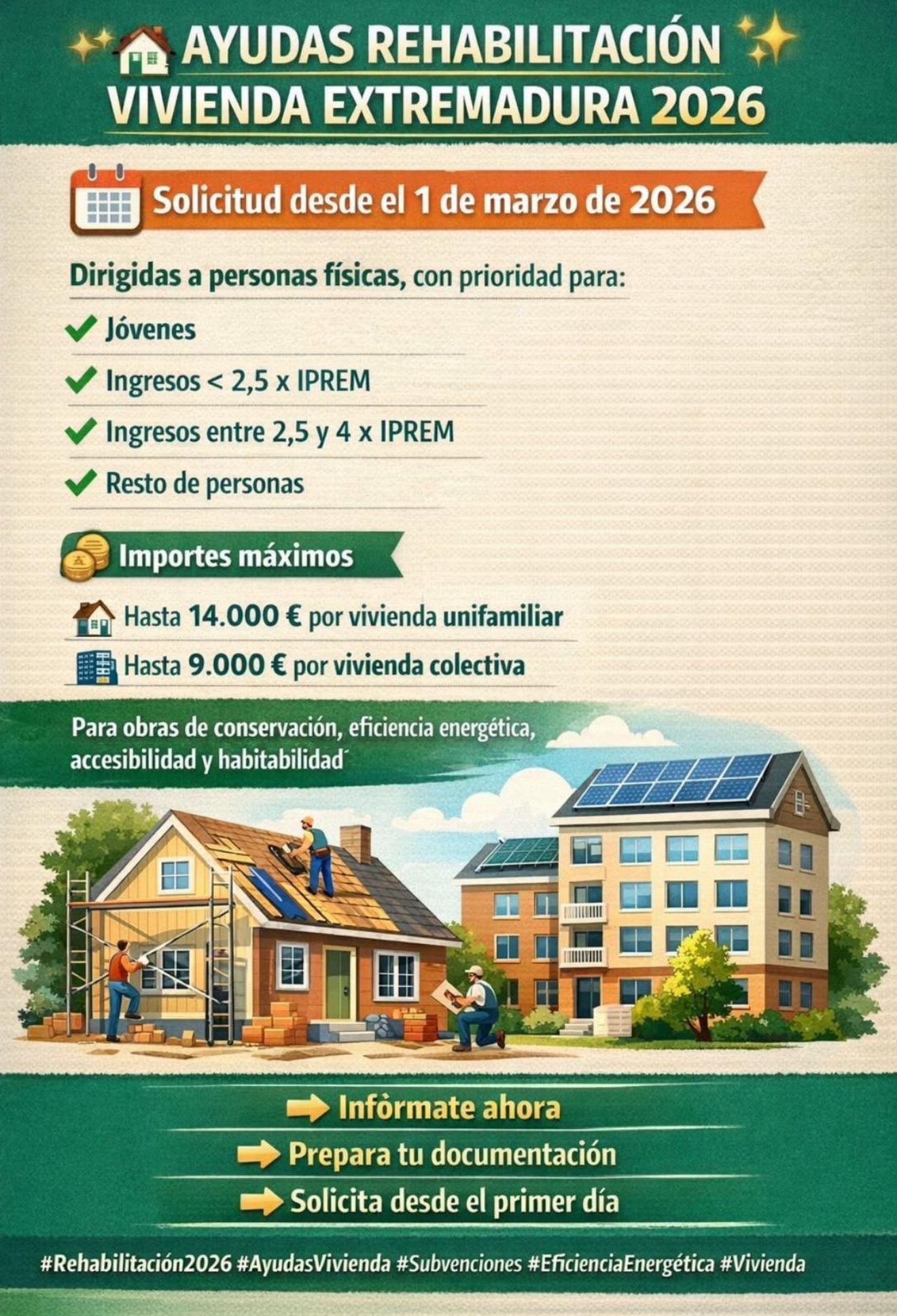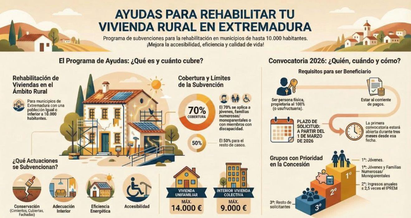 AYUDAS REHABILITACIÓN VIVIENDA EXTREMADURA 20262026-01-12 09:58:18Info GeneralSe publica en el DOE Nº 3, del miércoles 7 de enero de 2026, Decreto 177/2025, de 9 de diciembre, por el que se aprueban las bases reguladoras de las subvenciones del programa autonómico de rehabilitación de vivienda en el ámbito rural, y se aprueba la primera convocatoria de dicho programa de subvención.