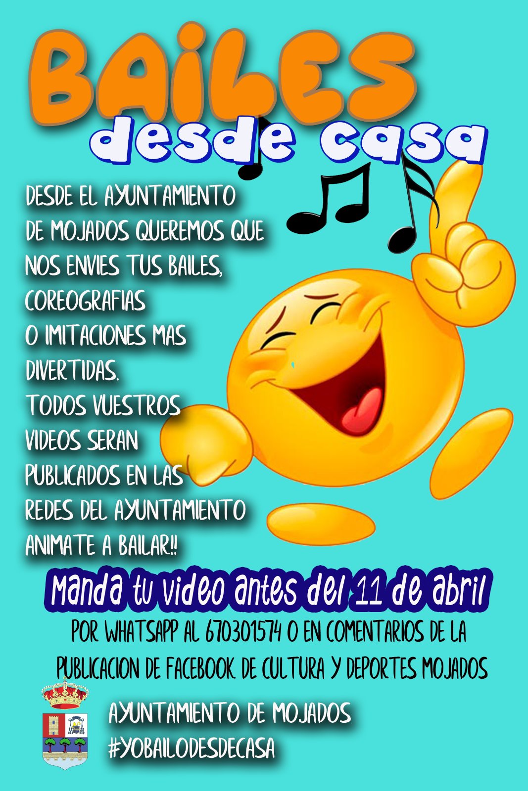 BAILES DESDE CASA2020-04-02 10:38:01CulturaDesde el Ayuntamiento, seguimos con los retos, para hacer más llevadera la cuarentena. Envíanos tus bailes o imitaciones mas divertidas, a través de whatsapp al 670301574. Tienes hasta el 11 de abril.