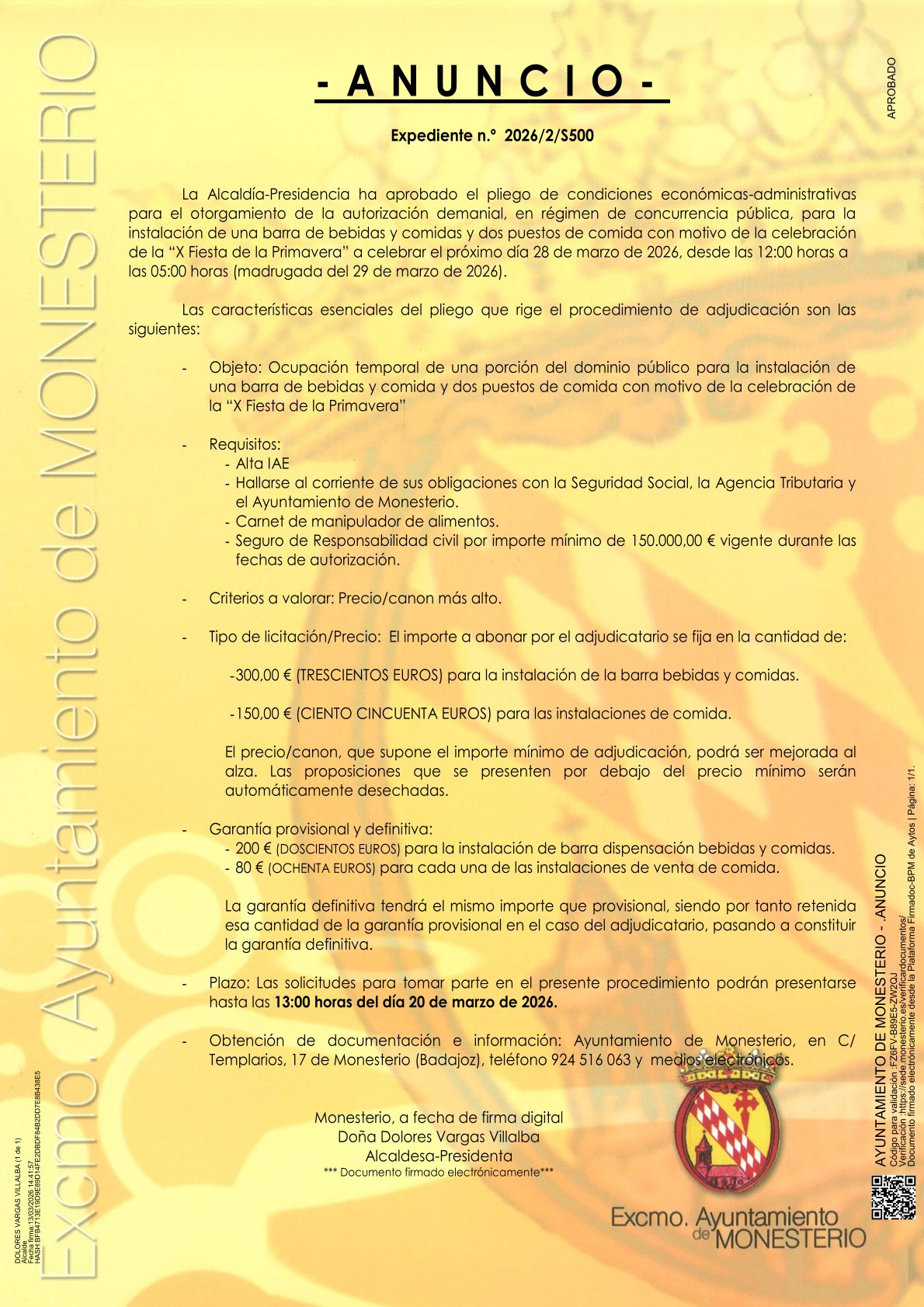 Anuncio de licitación de Barra de bebidas y comidas y dos puestos de comida rápida para X Fiesta de la Primavera