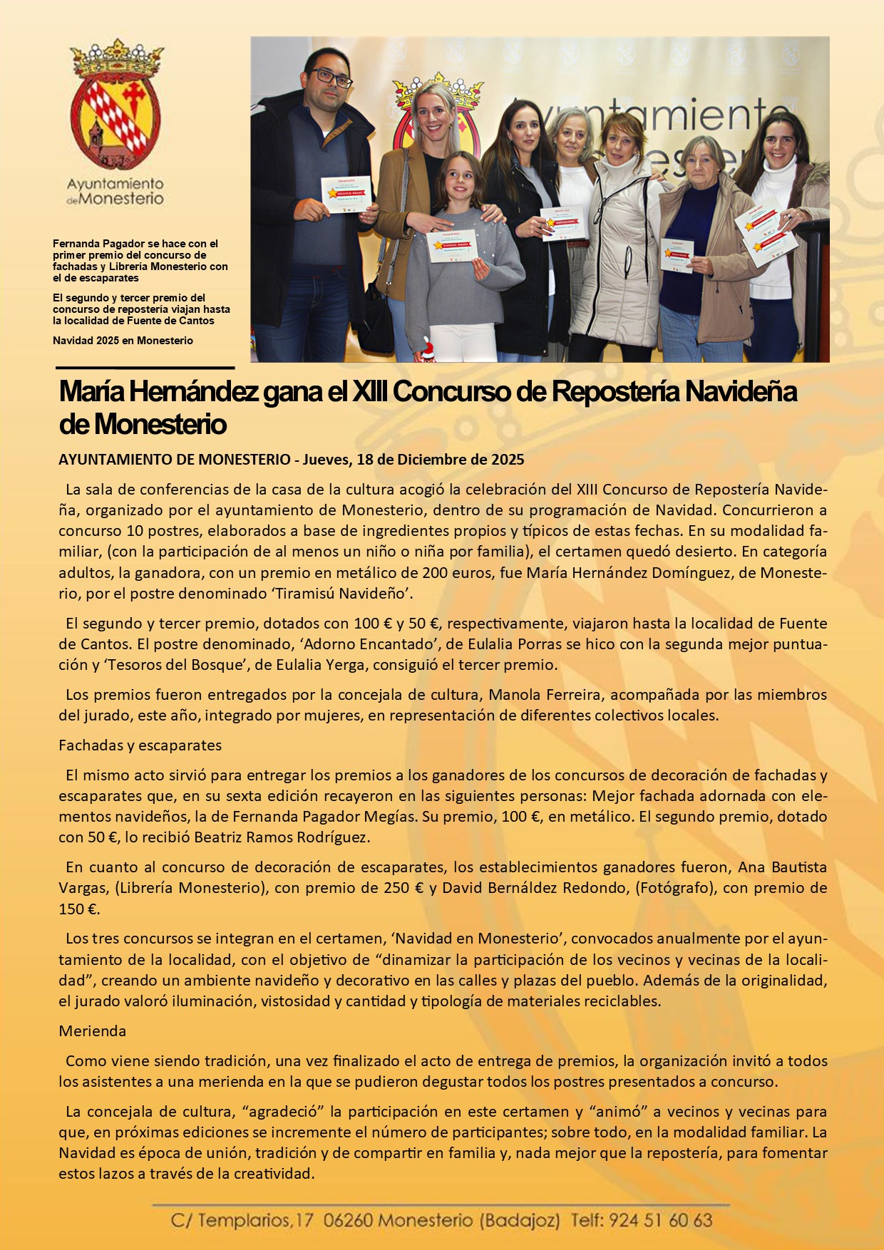 Fernanda Pagador se hace con el primer premio del concurso de fachadas y Librería Monesterio con el de escaparates