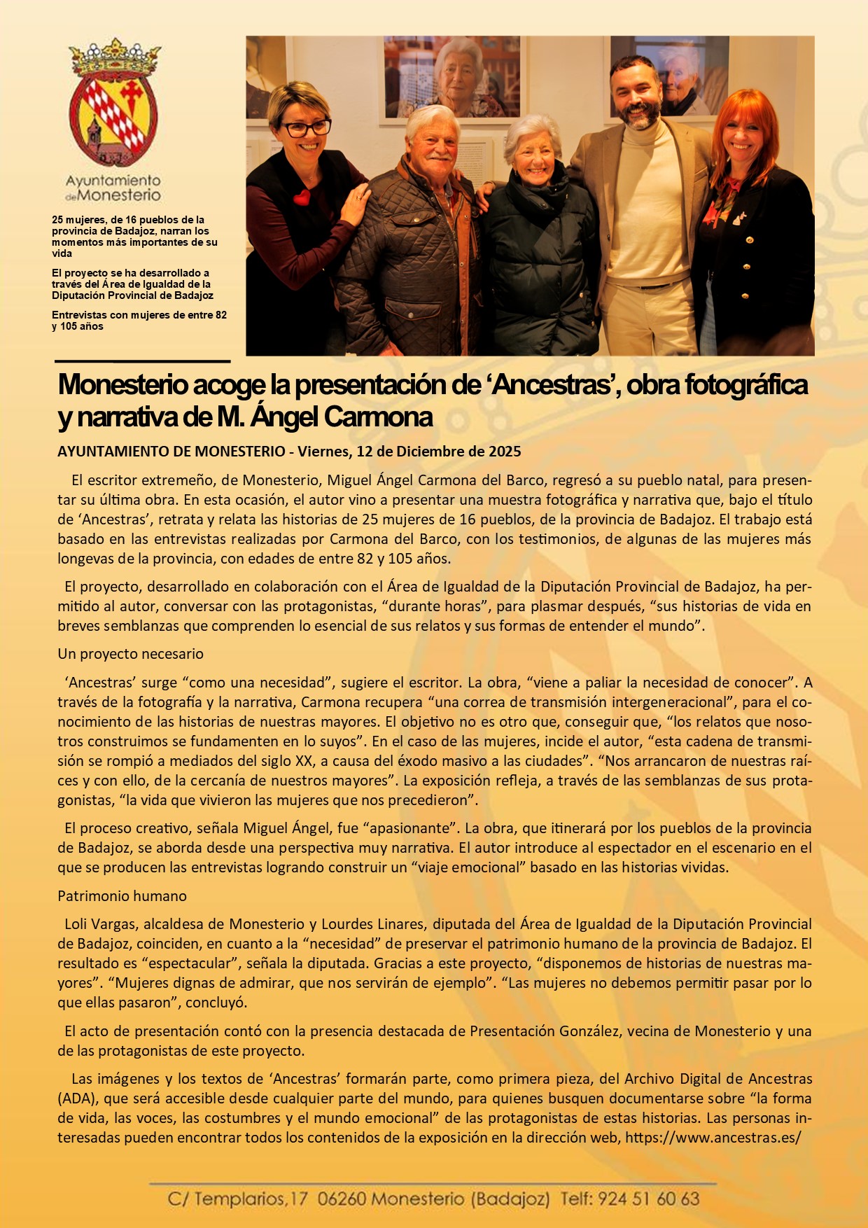 Monesterio acoge la presentación de ‘Ancestras’, obra fotográfica y narrativa de M. Ángel Carmona