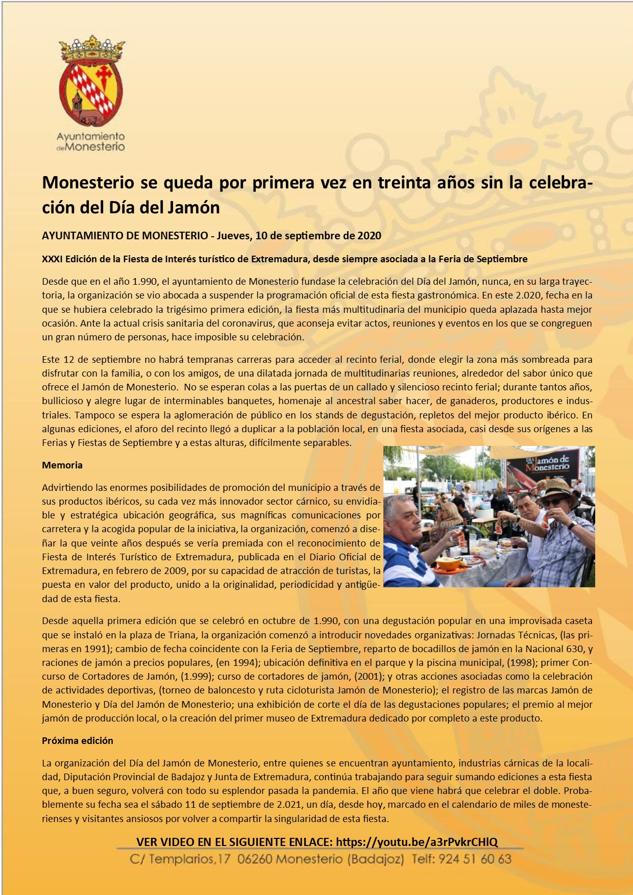 Monesterio se queda por primera vez en treinta años sin la celebración del Día del Jamón